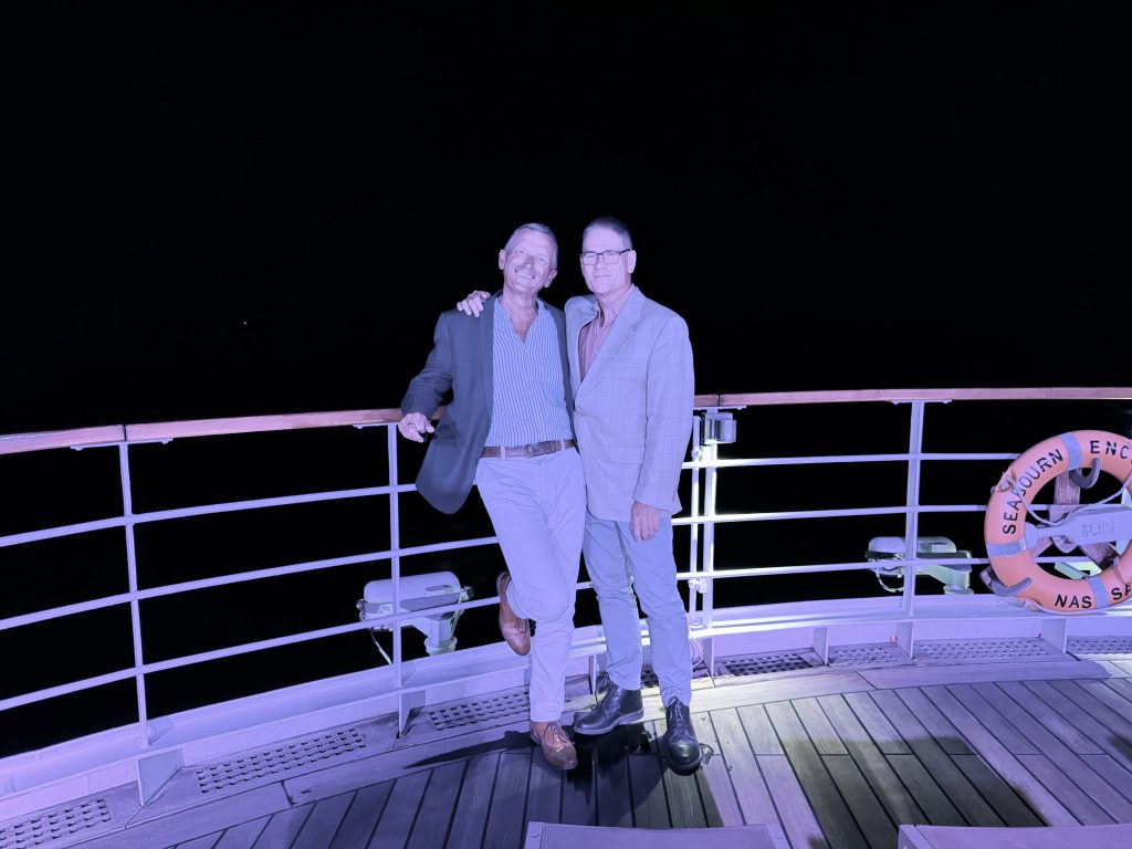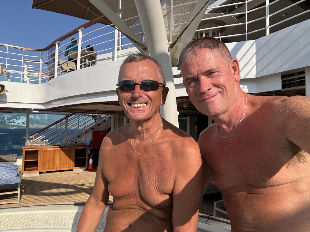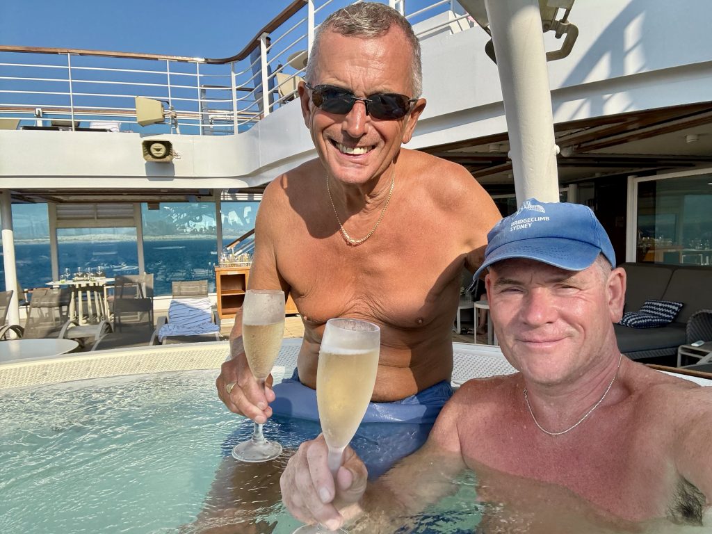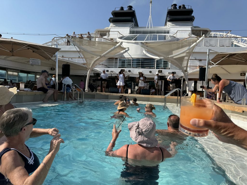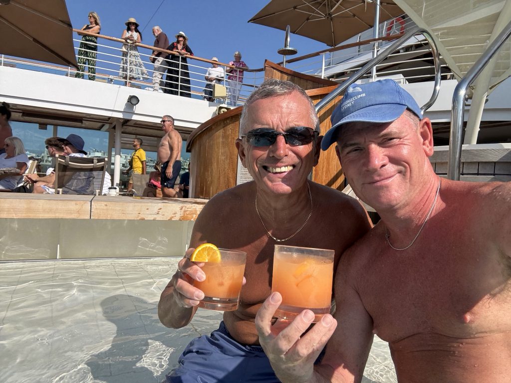 Meanwhile we have made contact with some early chronies – two Oz couples and an English couple all of whom are maximising their enjoyment! We spend a very happy couple of hours in the pool, first chatting and later enjoying the ship’s company sailaway to ABBA tunes.
