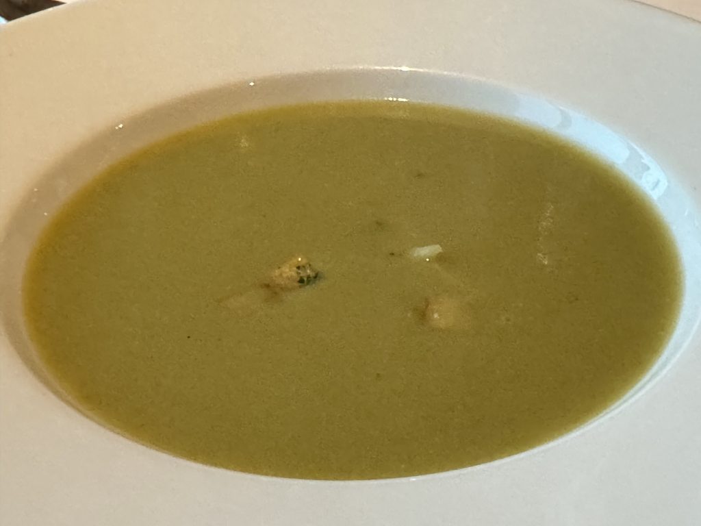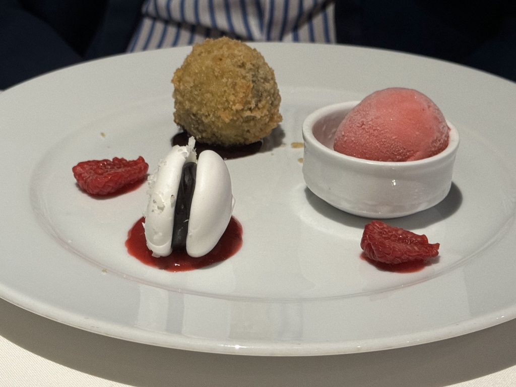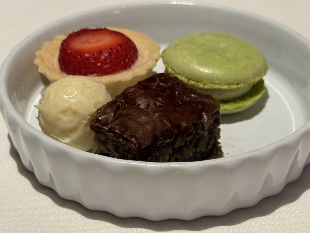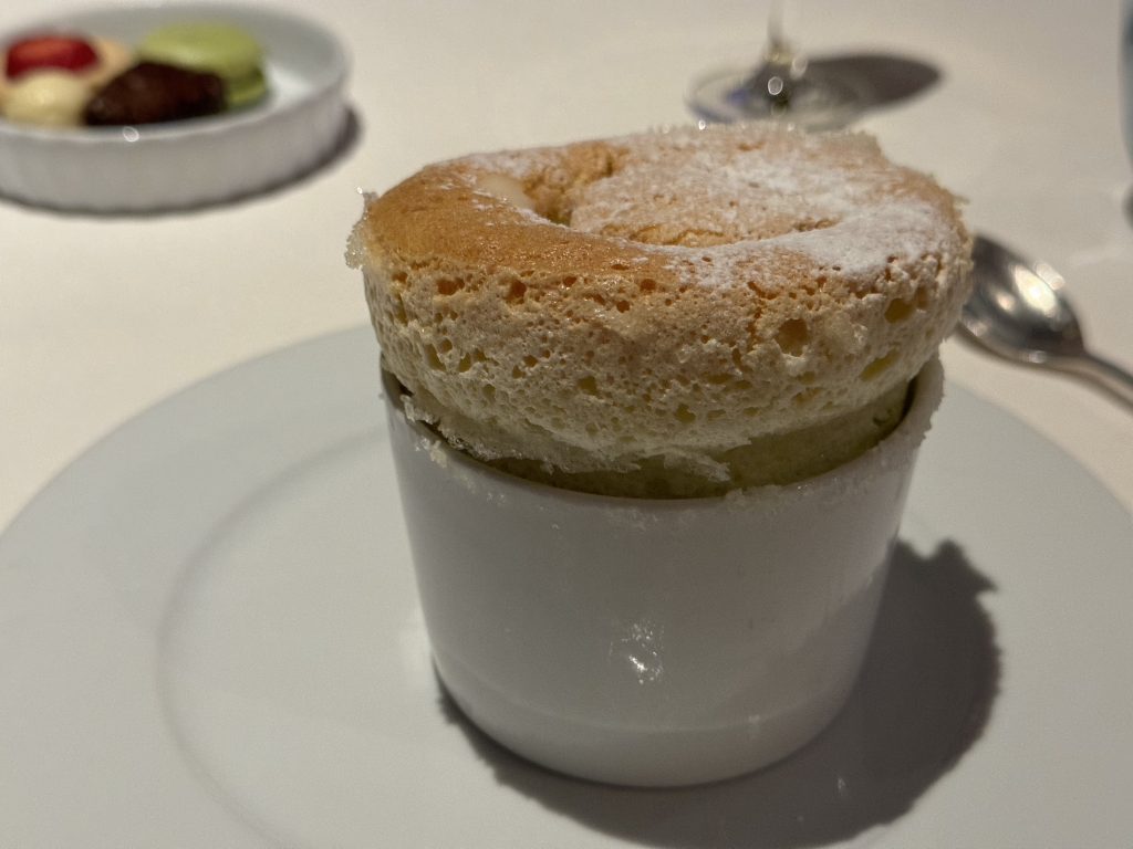 Hubby chooses crab salad, I have scallops and beef short rib to start, followed by asparagus soup, and we both have lamb loin for main. Puddings are meringue and nougat whilst I have pistachio soufflé, before demolishing the petit fours.