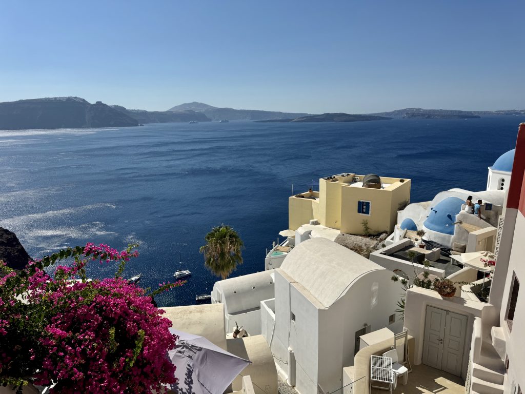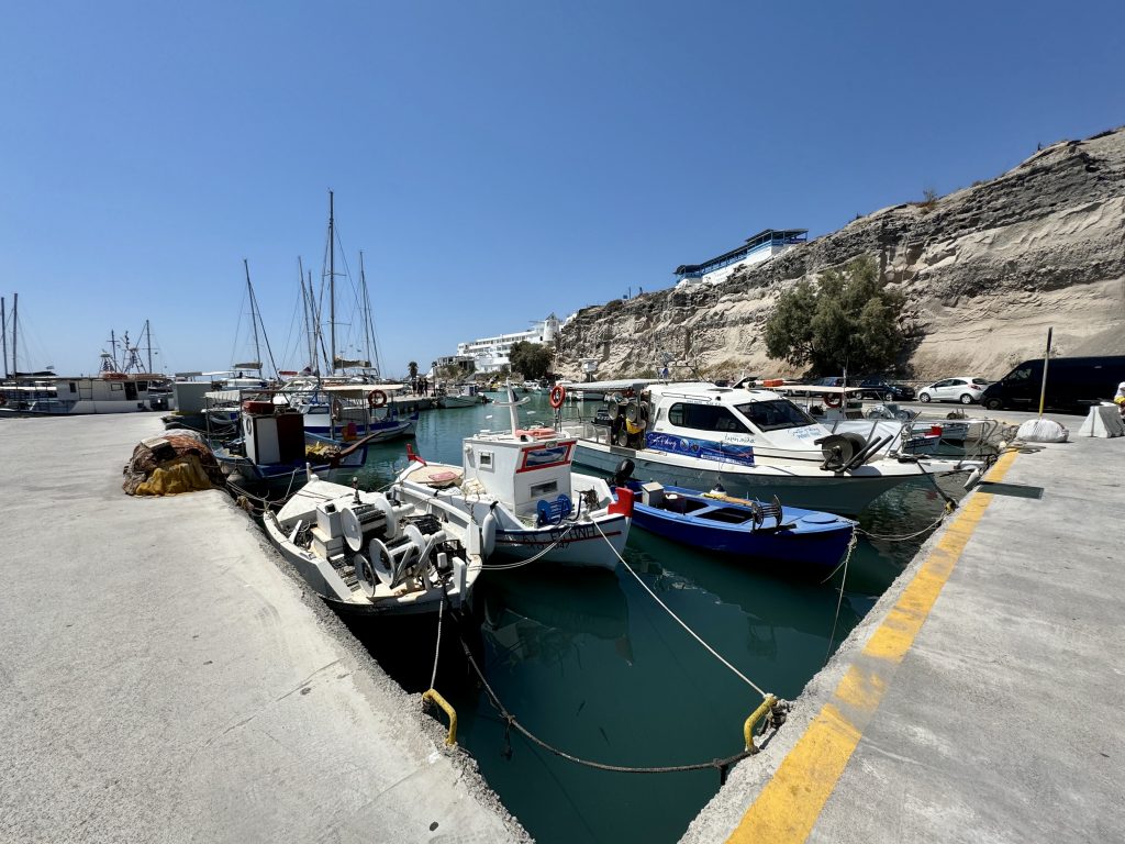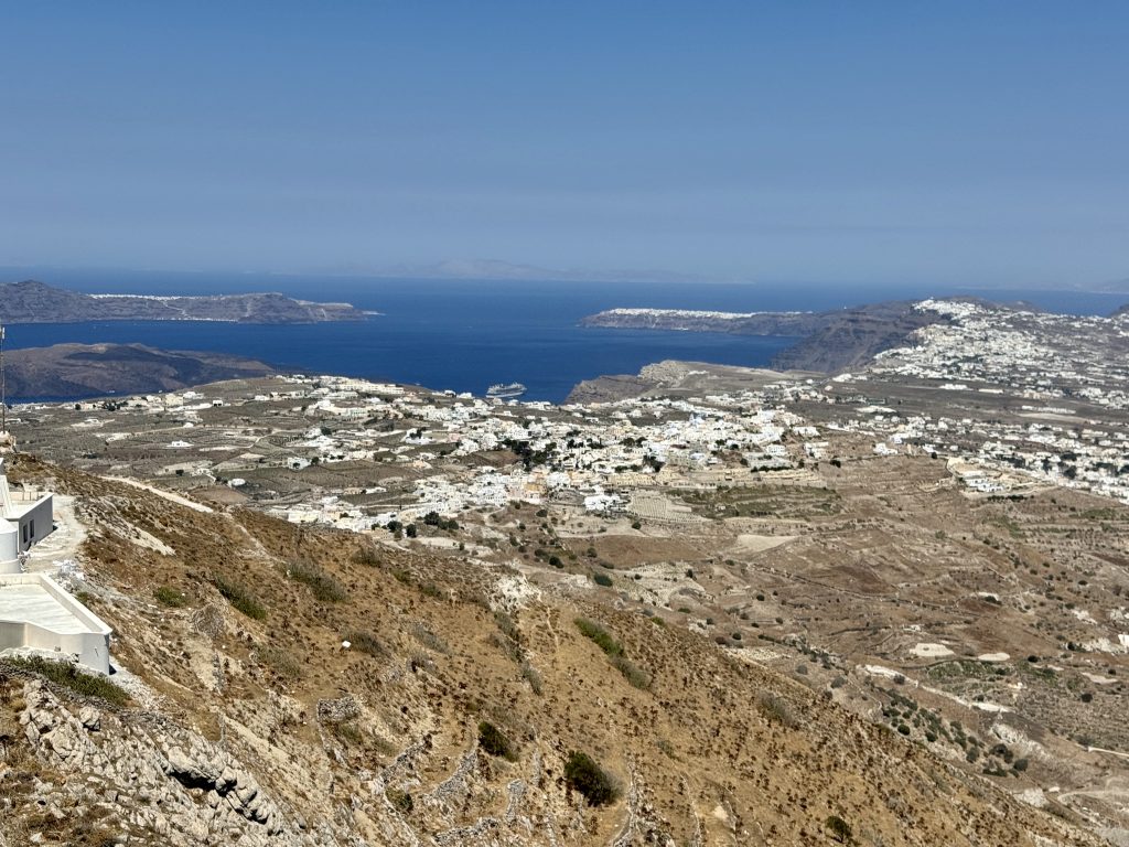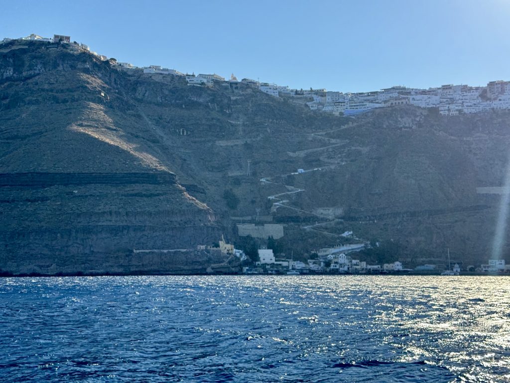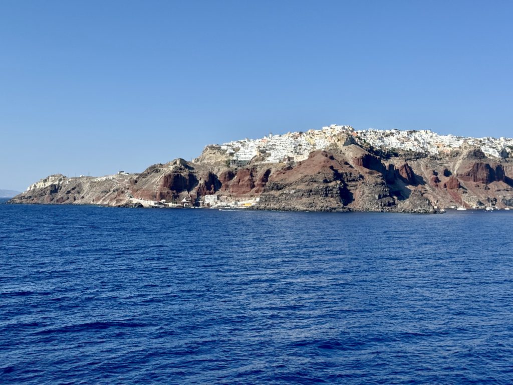 Santorini is a flooded caldera after the eruption 3500 years ago which tore the island into one large crescent and the several smaller ones which would have formed the missing part of the volcano. It must have been quite a spectacule when the sea rushed into that enormous, hot void. Two smaller eruptions have since created the old and new islands inside the caldera. Ships cannot anchor as it’s too deep, they just float and reposition occasionally.
