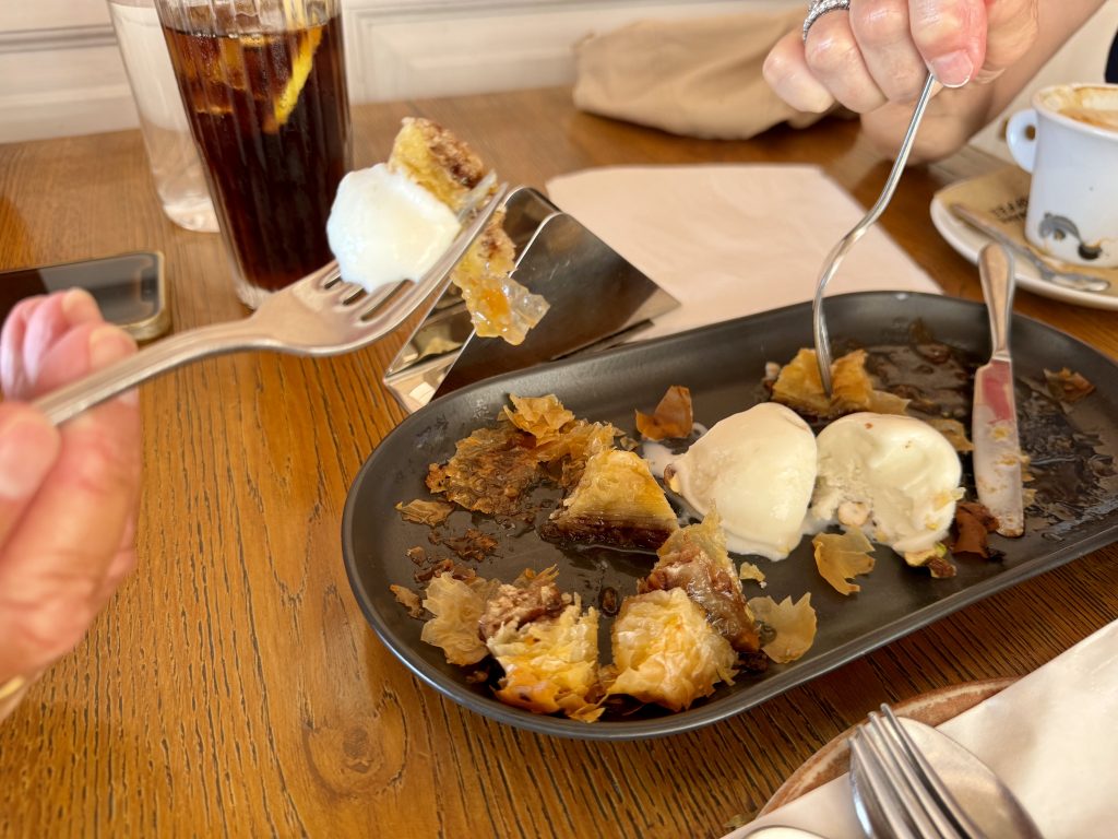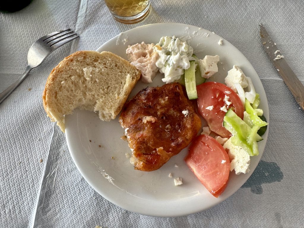 The Greek salad, tzatziki, tarama, sardines and tomato pancakes are all wonderful, the beer just perfect – even my zero version.