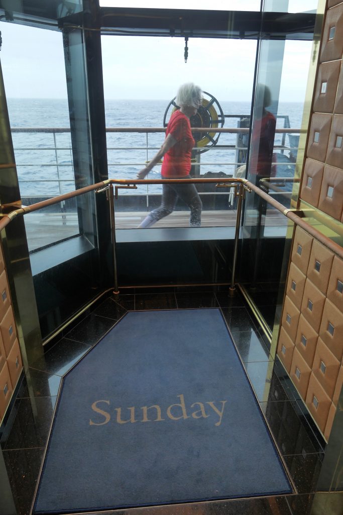 Although small by current ship standards, the layout is very comfortable, mostly dictated by a few significant structures, such as the theatre at the pointy end which spans decks one, two & three and the Main Dining Room (MDR) at the blunt end which is on decks two & three. Otherwise on deck one, apart from the stalls and stage and what in the olden days would be called the purser’s office, it is all cabins. On decks two and three are all the public amenities such as bars, shops and two eateries – MDR and Pinnacle Grill. There are no cabins on two or three. Three is the one where walking takes place – one mile is three times round.