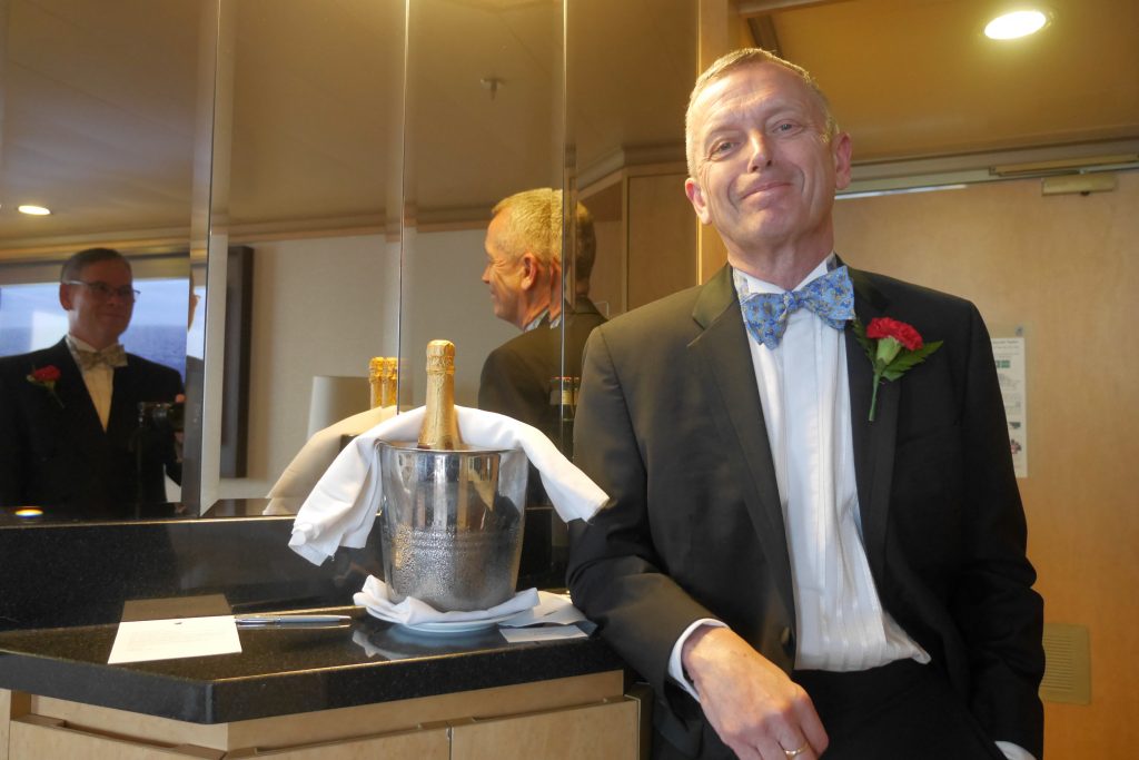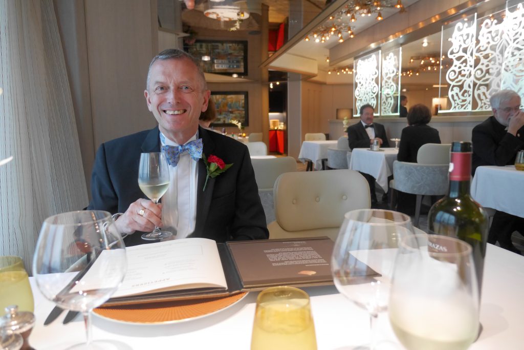 After all this I need a lie down so rejoin Hubby on the after deck but it’s getting cold now, before long we go in for a soak and dress for dinner. It’s formal tonight so carnation corsages have arrived in our room to enhance our DJs.