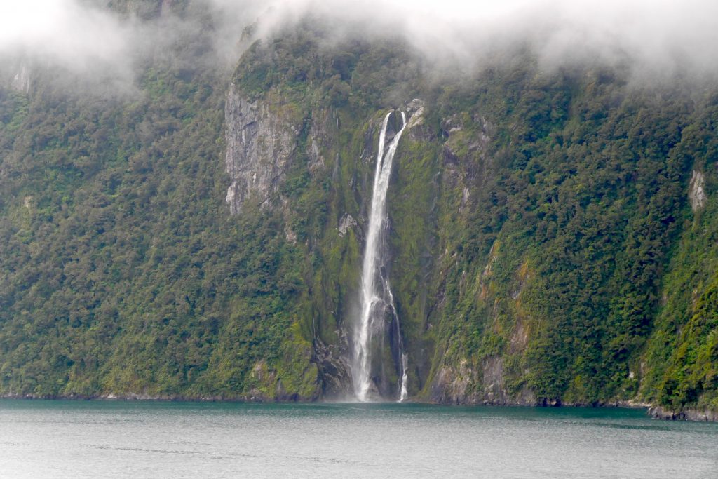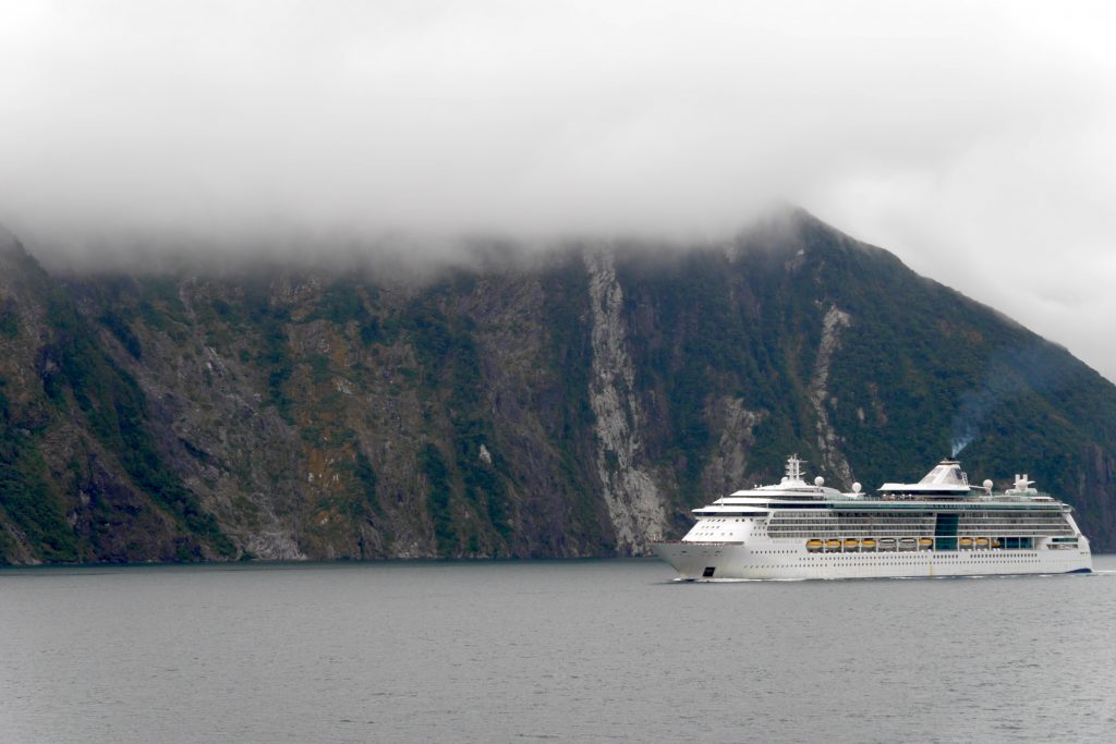 Scenic cruising is a euphemism for no ports today. Instead we’re wandering around the fjord lands of South Island New Zealand. It’s an early start yet again, and we’re on the foredeck, open only on special occasions, to watch the pilot arrive who then guides us into Milford Sound.