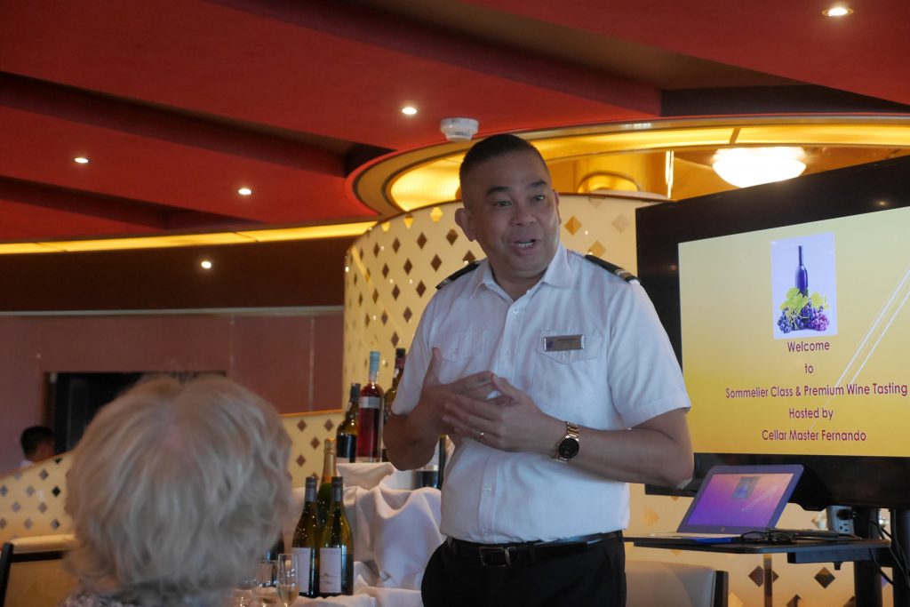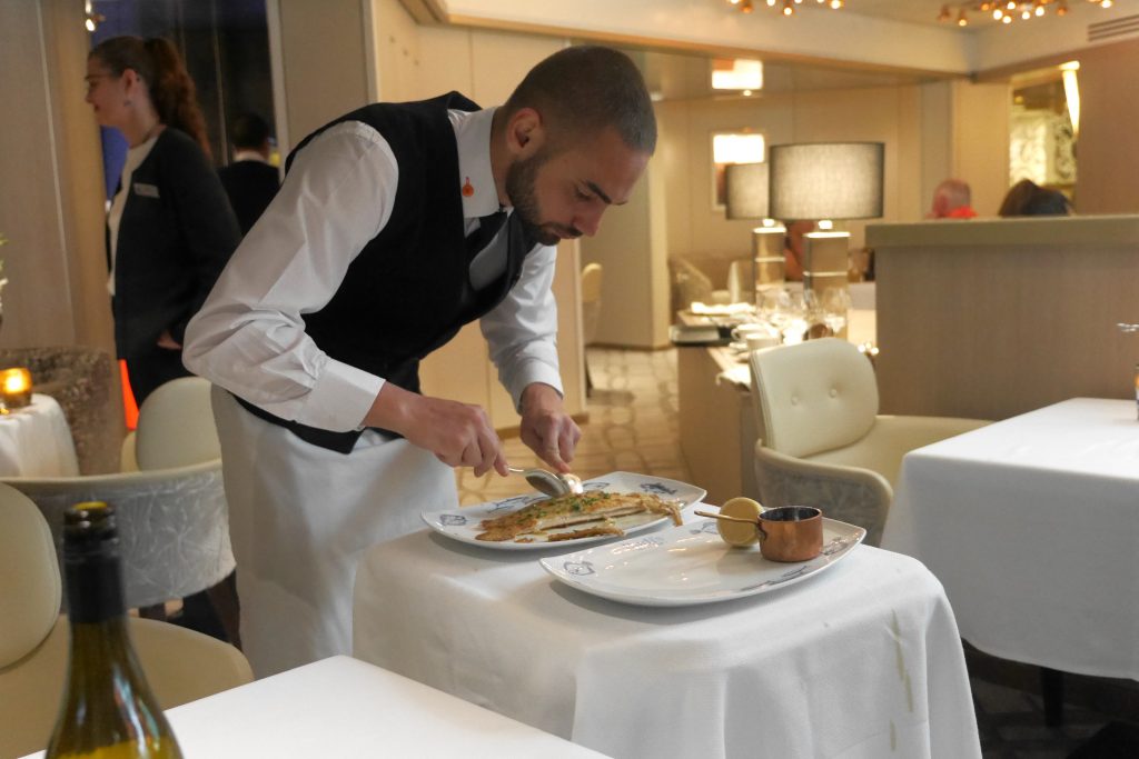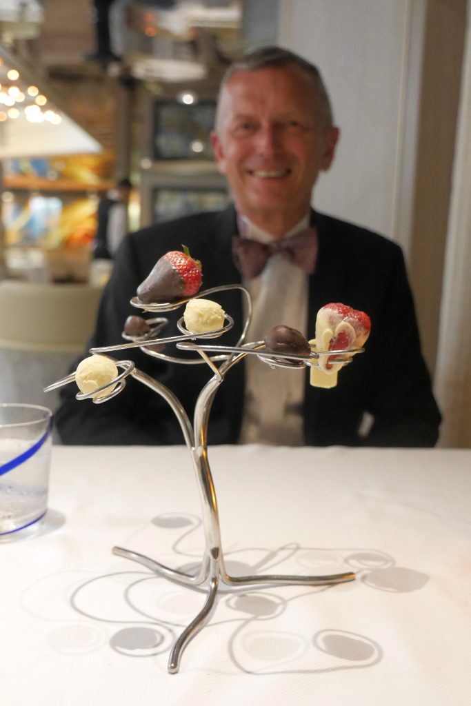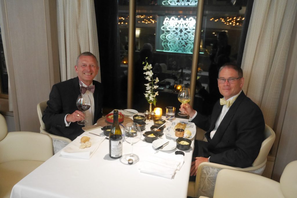 After a while it’s time to dress for dinner, which being a formal night means the full DJ experience again, although sadly our corsages have withered and died so they are not getting a second wear. Tonight is another special dinner, this time the chef-patron of Pinnacle, Rudi Soderman has lent his hand to Sel-de-Mer which as you’ll not be surprised to know in eight characters is his French fish menu.