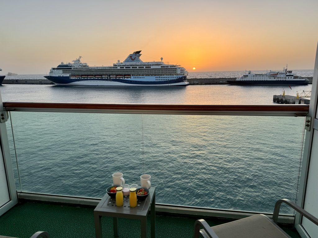 It feels really odd to be berthed in our home island but still be living onboard. Even for our friends Jacs and Mike it’s the same, they have a night here before driving to their home in the next village to us, Callao Salvaje. Breakfast on our balcony sees the sun rise.