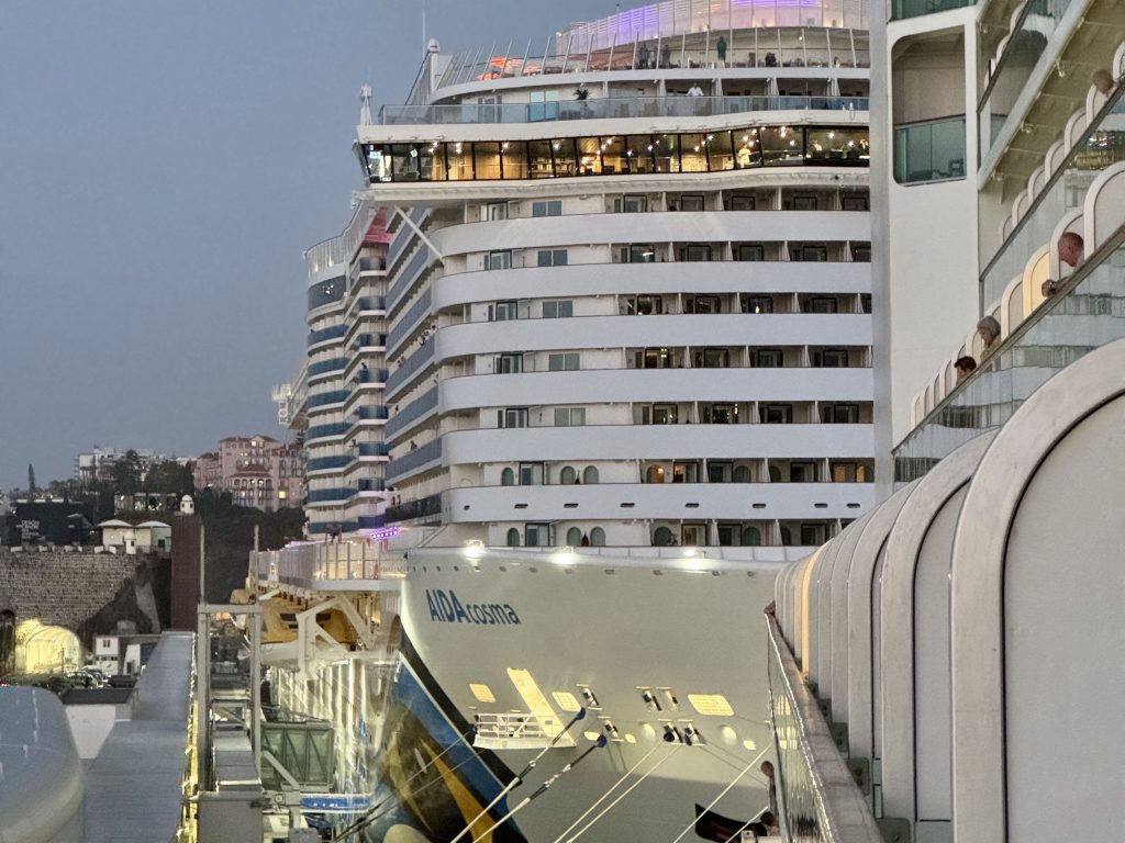 The port has grown somewhat since my only other visit 31 years ago, but I still remember quite a lot of that day when QE2 brought me here. Today we’re berthing on the new harbour arm which is huge, long enough to accommodate us alongside side a new megaship, the Aida Cosmos, which can carry well over 5000 Germans at a time. Later in the day we have a conversation with a lovely couple from this ship, she’s mostly happy but says the MDR is horrendous and indescribably noisy, with babies and children everywhere!