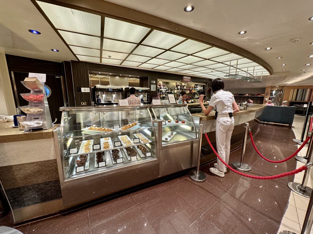 Before we dock, we watch our arrival with breakfast on our balcony, opting for room service which is more simple than Seabourn or Holland America, and I nip down to the Costa shop to get a proper drink.