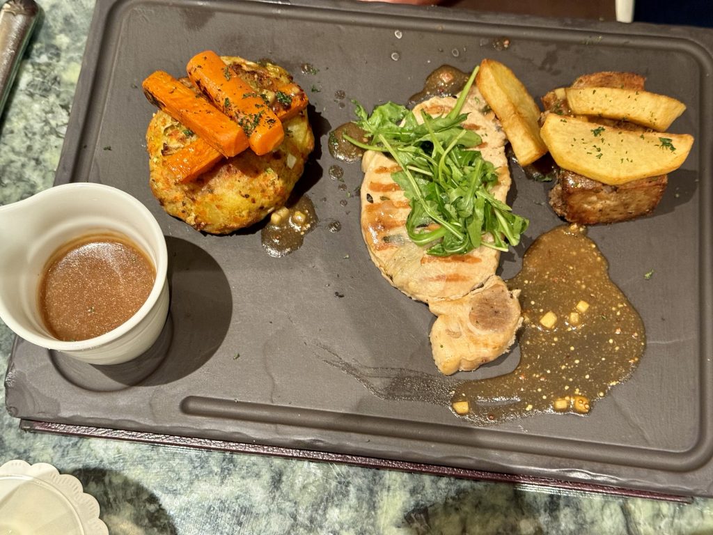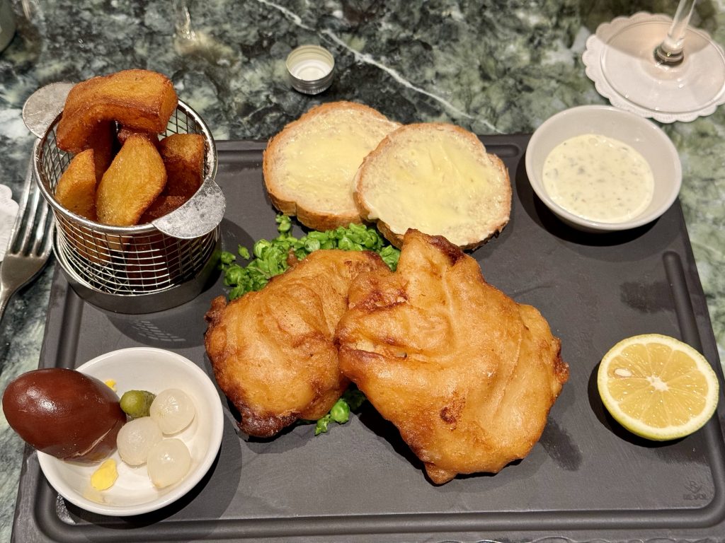 A very trendy space which is informal, has both dining and lounge tables as well as a bar dining, we opt for the comfort of sofas and take a lazy graze though the menu. We still manage two courses including fish & chips and pork two ways. It’s very nice that each dish has a matched wine chosen by celebrity chef Olly Smith, and their list is definitely the best onboard.