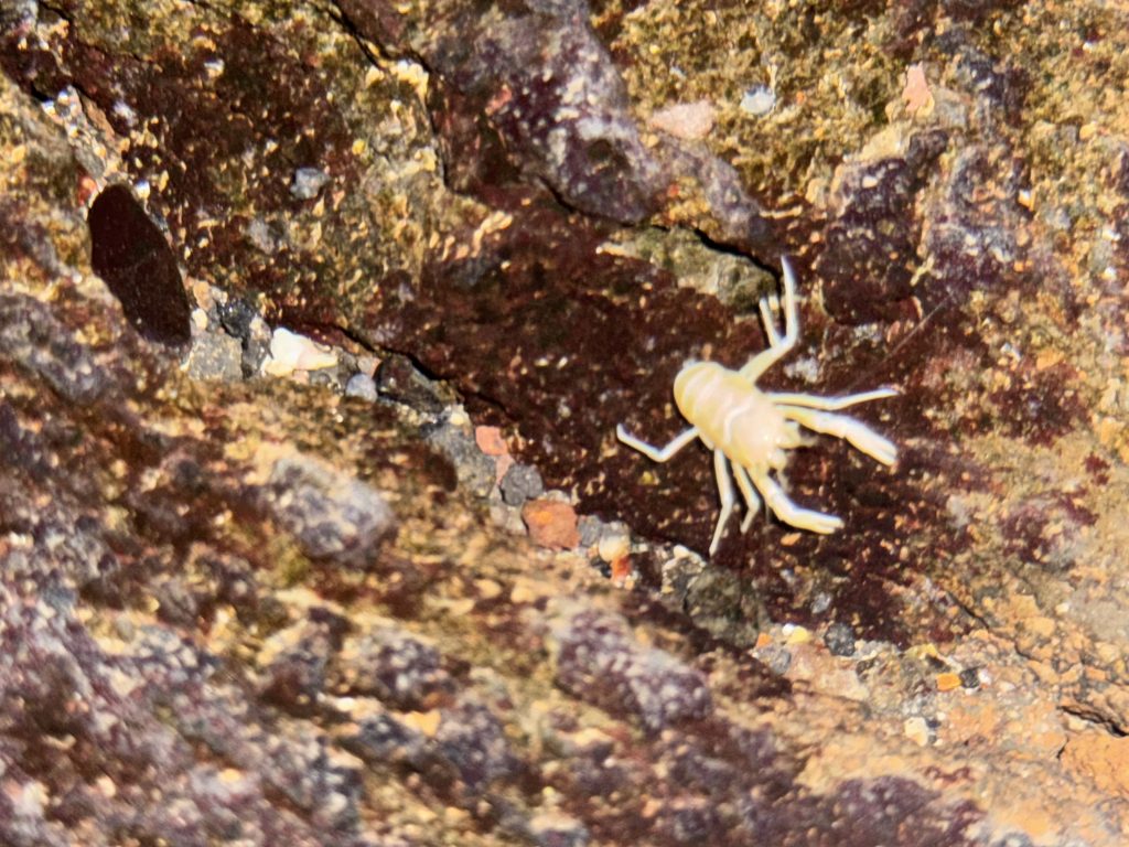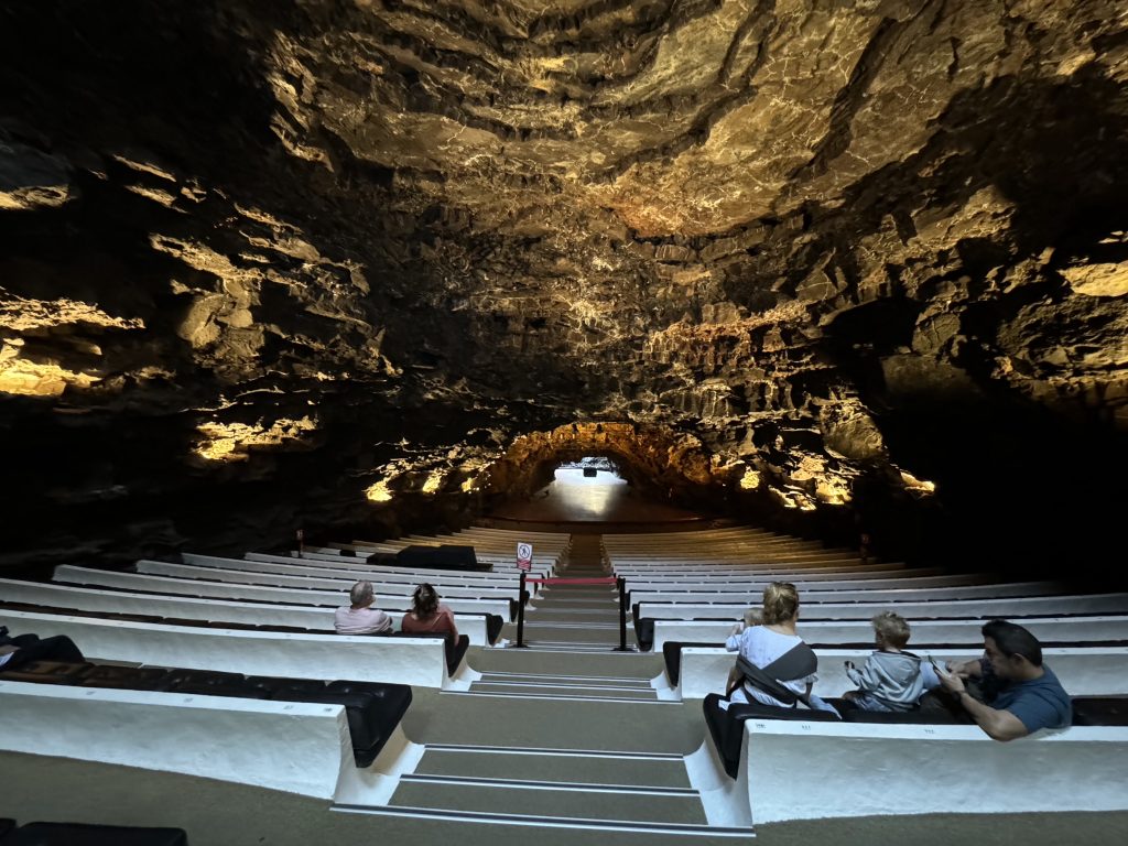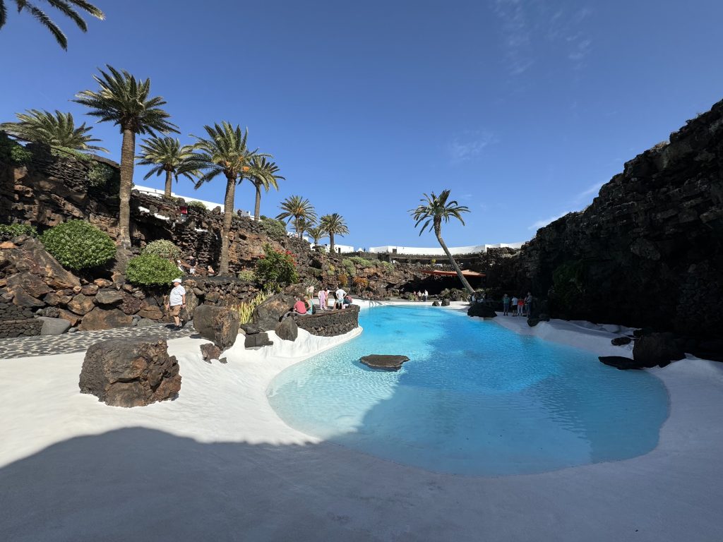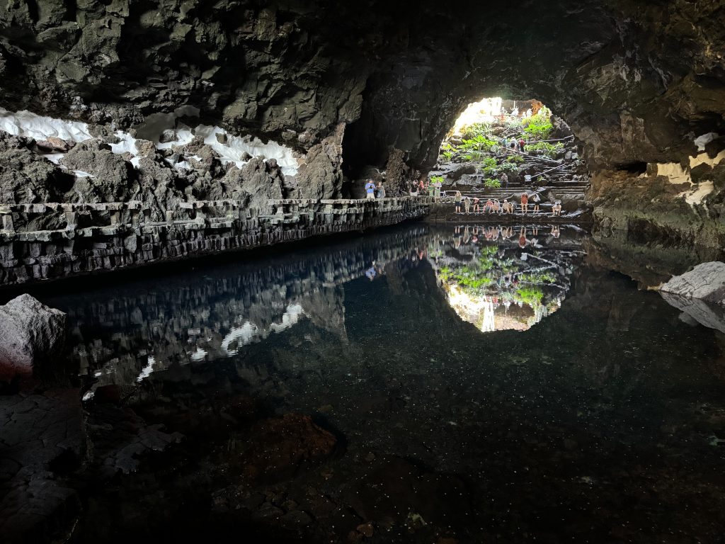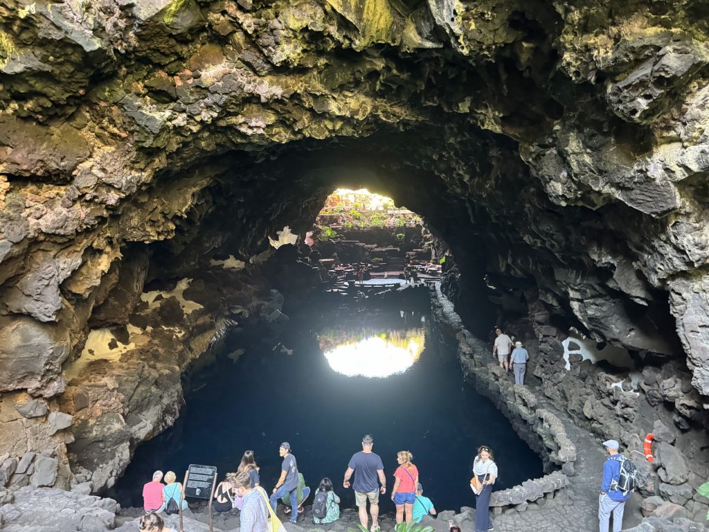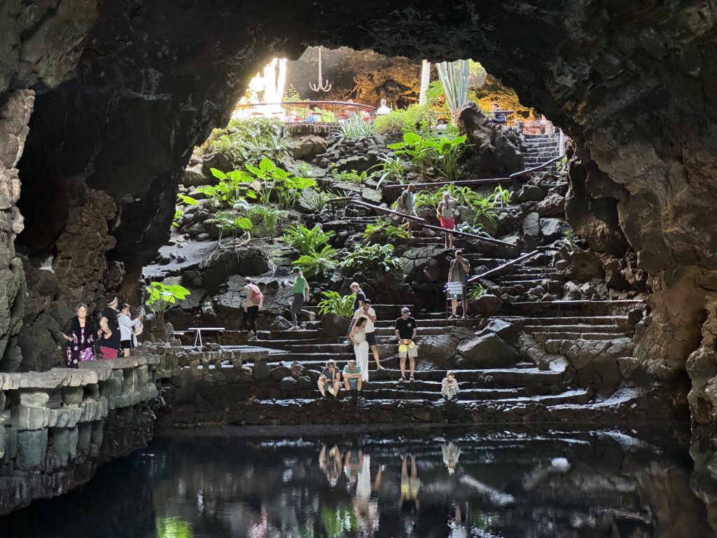 At Jameos del Agua we visit a lava tube, which is what happens when a lava flow forms a solid roof whilst the molten river continues to run below. Later, when it’s all cooled down a long underground tunnel is left. Here we visit a section which is remarkable in its size and also its inhabitants – a small blind albino crab which isn’t found anywhere else in the world. In another section there is a natural amphitheatre.