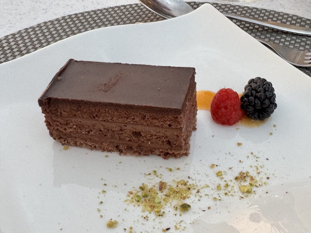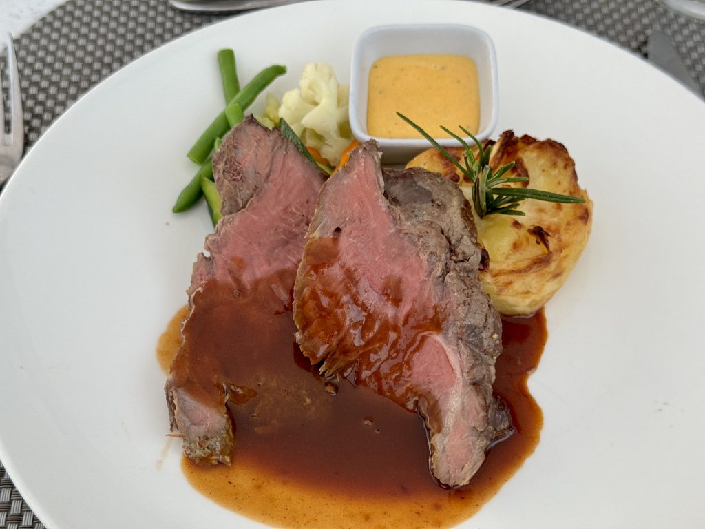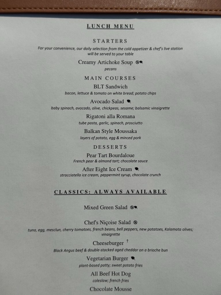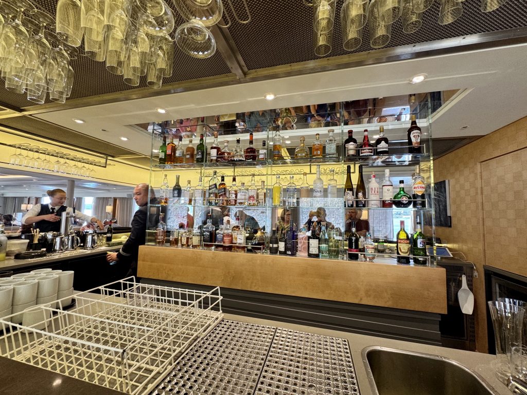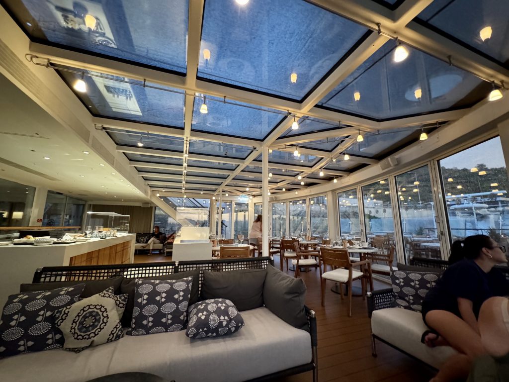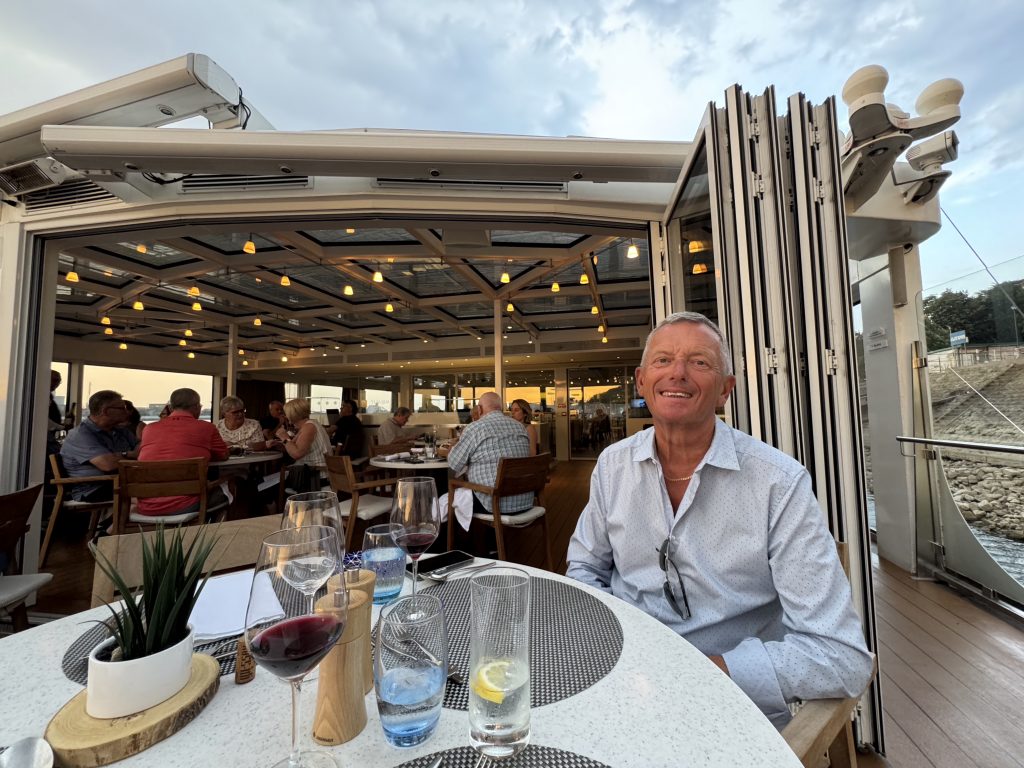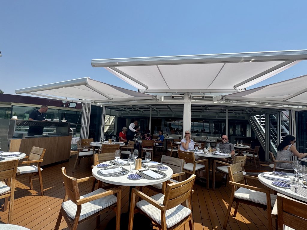 There is the inevitable welcome aboard event tonight so all 190 customers are squozed into the lounge, which is pushing things a bit, however we get to see the Captain, Chef, cruise director, hotel manager and a couple more significant members of staff, and toast them and our journey. Shortly after, the CD announces that dinner is served and the swathes all rush to get into the dining room. We strategically hang back, and thence head forwards to Aquavit again, to secure our alfresco dining table.