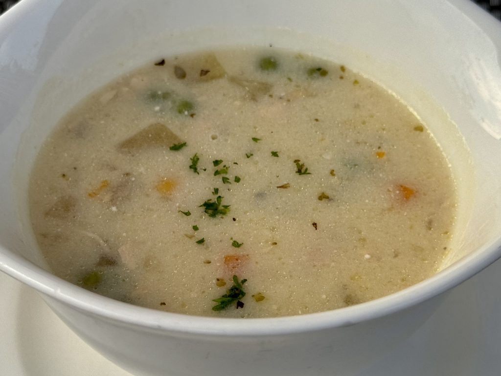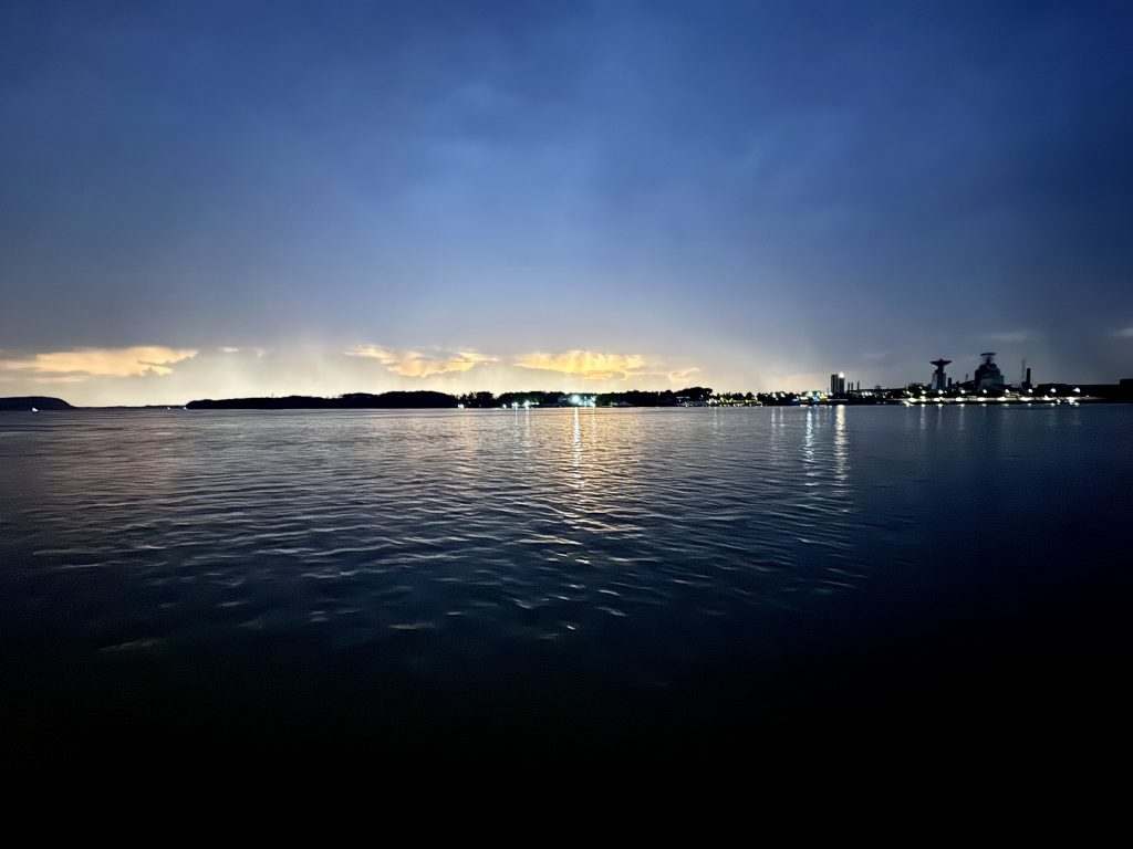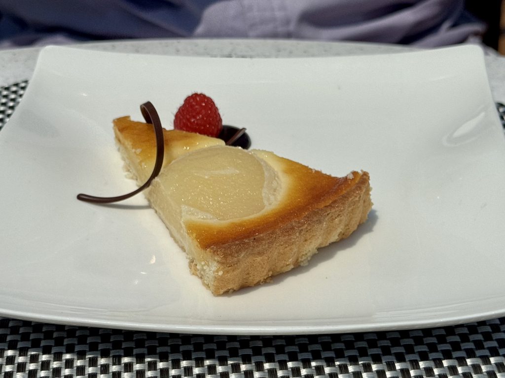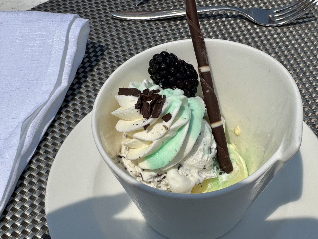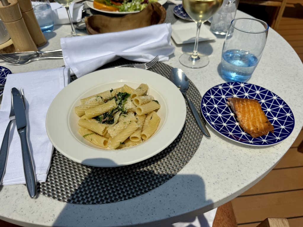 We board, check out our room then go looking for luncheon. We find the Aquavit terrace, which is at the bow of the boat, and after excellent amuses, enjoy a burger and pasta complete with a BBQ salmon on the side in the blazing heat – so hot the cutlery is unmanageable and our waiter fetches new ones from inside. Pear tart and After Eight ice cream finish lunch nicely accompanied by a tasty Chardonnay.