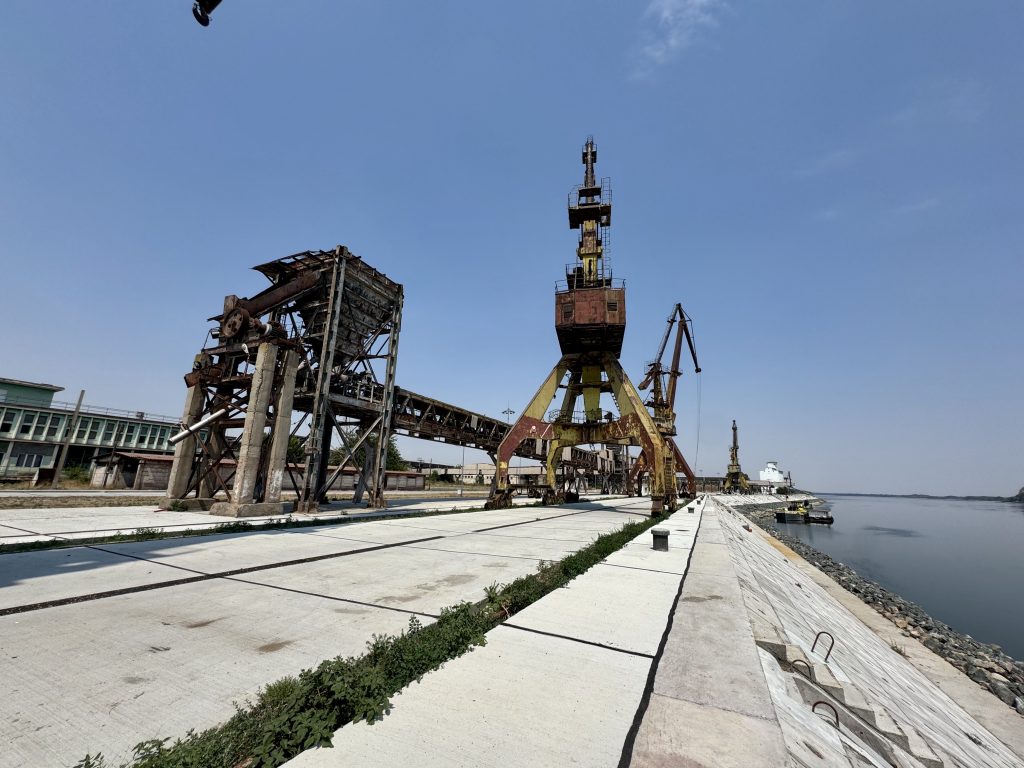 Turnu Măgurele has a really run-down dock area, which we park adjacent to, so we go for a wander downstream, past the rusting cranes, the crumbling conveyors, and on to some rough ground, where a few people are playing in the Danube. We hit a natural drain, and decide that’s enough so turn around, backtrack and then head upstream a while until we come to the ferry ramp across the Danube, which forms another insurmountable obstacle.