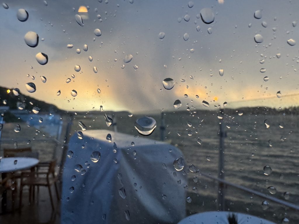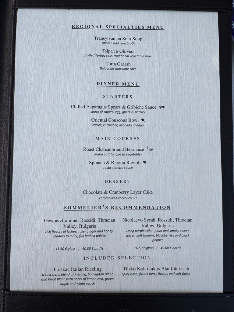 We go for Cæsar and sour chicken soup starters, followed by chateaubriand, and finish with Torta Garach, Bulgarian chocolate cake. It’s all very good, and we pair with Petit Chablis and Bulgarian Syrah, both excellent. Just as we’re finishing our pudding the heavens open and we are treated to an exciting thunderstorm which goes on to rage for several hours.
