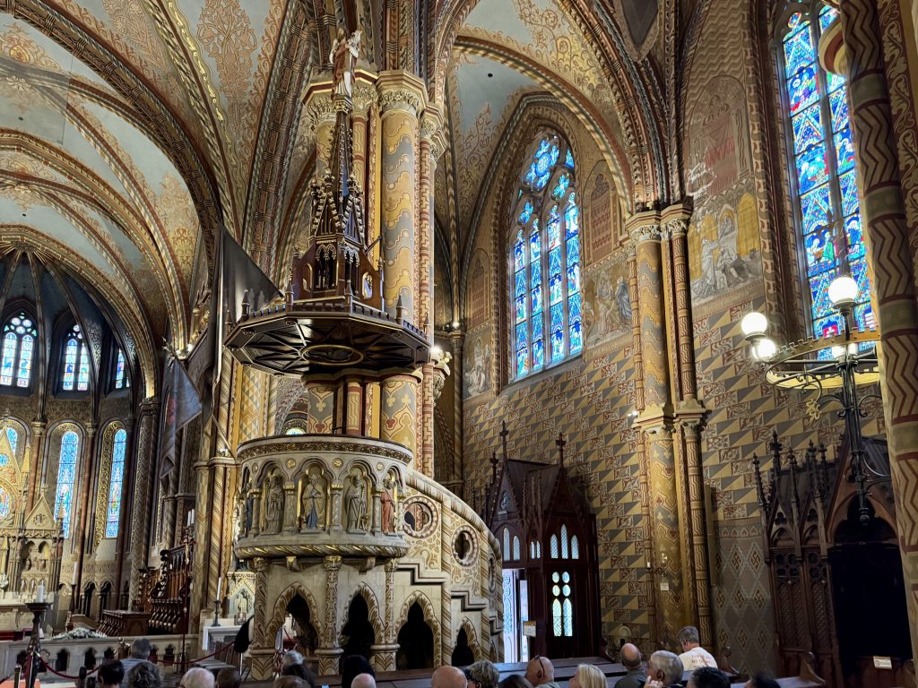 Our first, well only, stop is on Castle Hill, the site of the former palace, and many government buildings, and is undergoing considerable restoration. Indeed there are some newly replicated old buildings we didn’t see last time, the first two photos. We start by taking a look over the Buda hills in the distance, where a lot of the 1.8 million population of Busdapest live, before heading to Matthias Church, parts of which allgedly date back to Saint Stephen in C11, although it’s present incarnation started in C15.