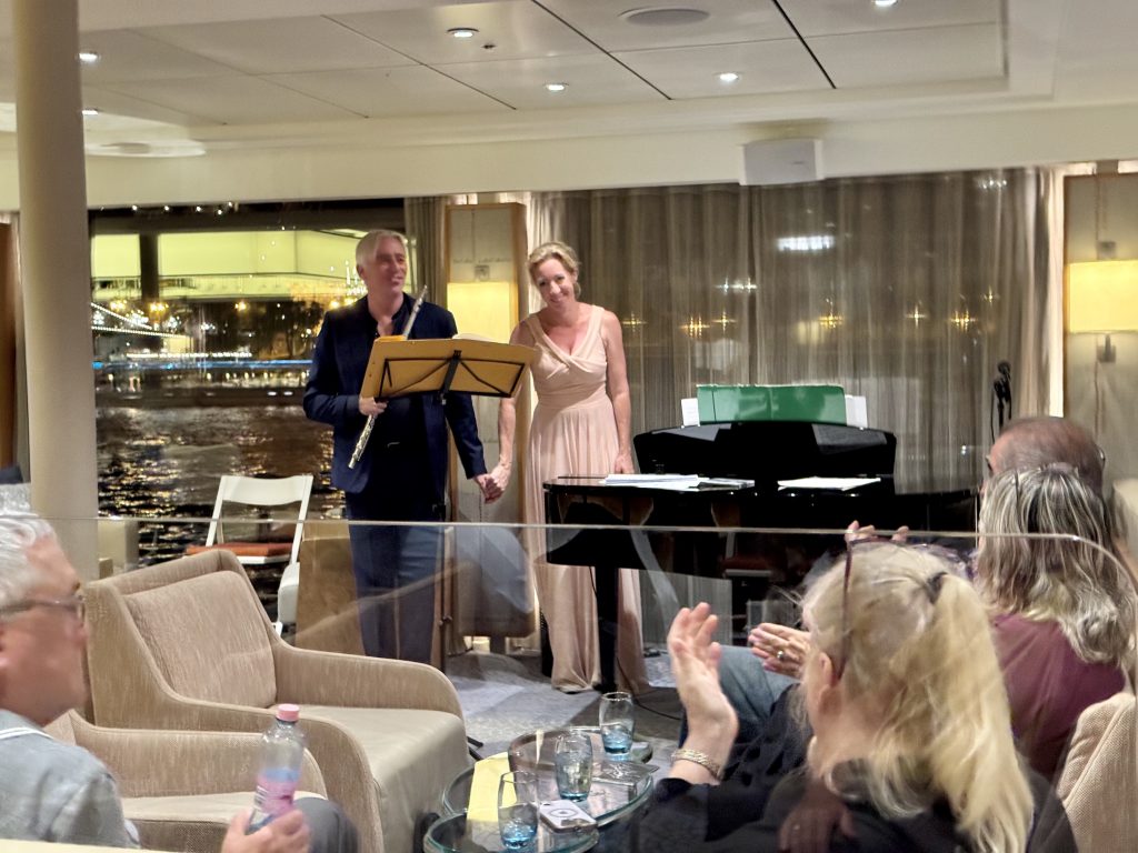 We get a short walk after dinner, just up to parliament. We walk past the harrowing shoes memorial which tells the tale of 60,000 Jews who were sent to camps from Hungary, including 3500 who were shot on these steps and thrown into the Danube. We are back in time for a classical concert, a flautist and pianist, who give an excellent recital to a very small number of customers in the lounge.