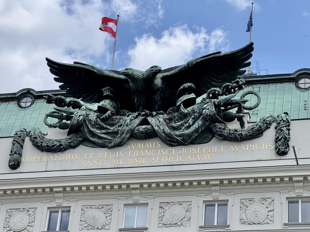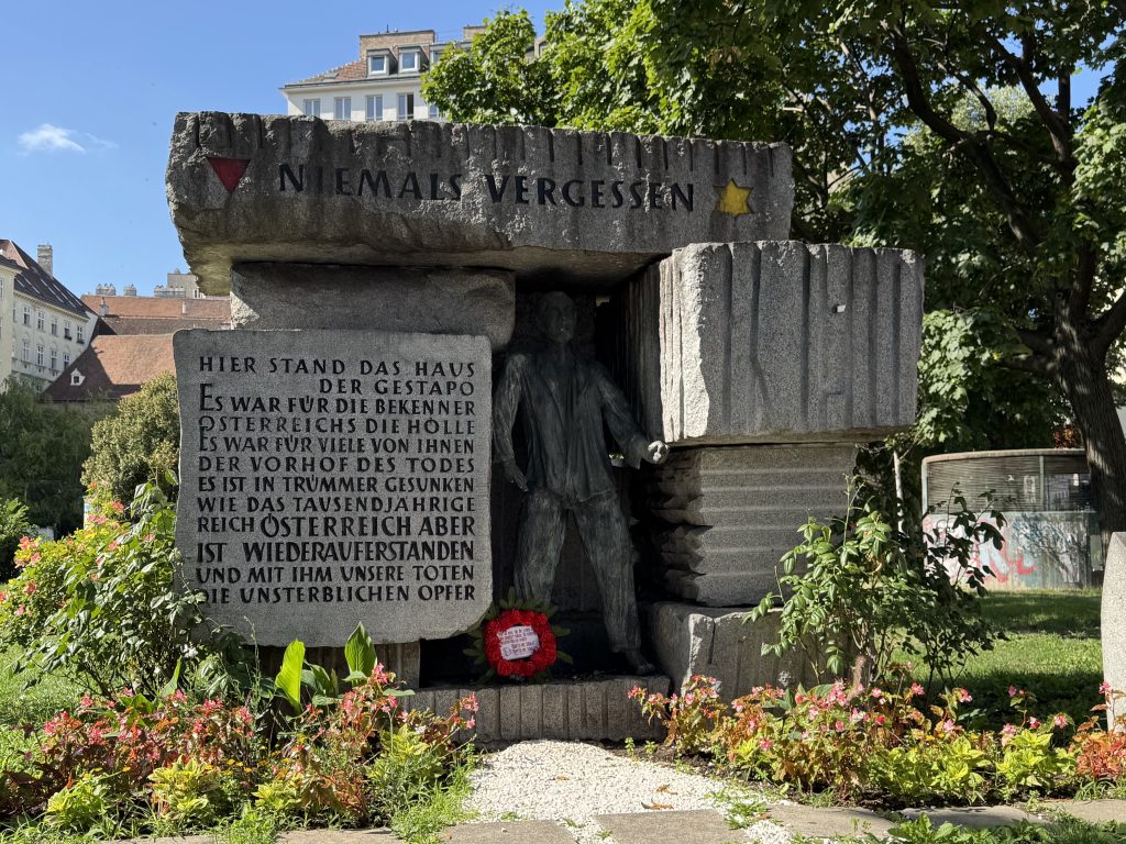 We walk into Vienna using mostly the same route as yesterday. A slight variation finds a memorial to a former Gestapo building but I cannot find out anything else about it.