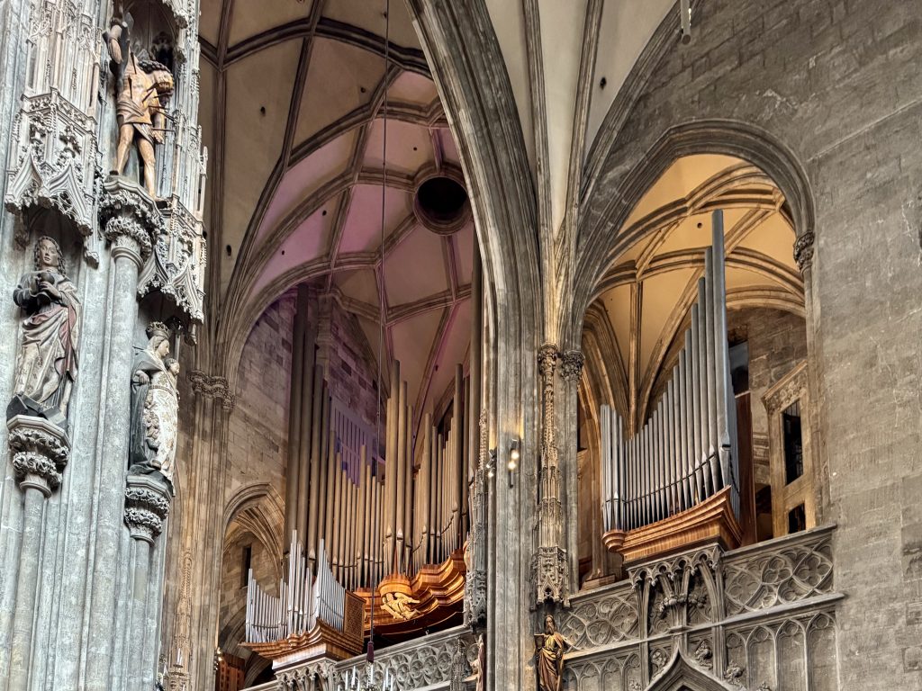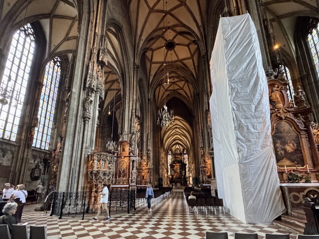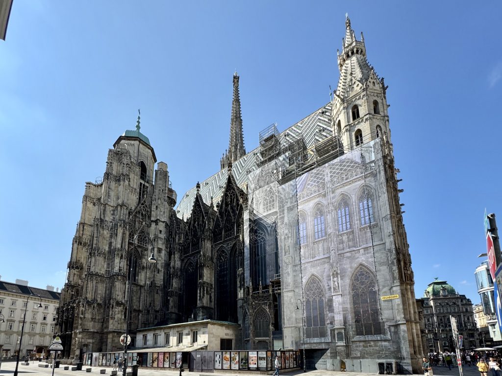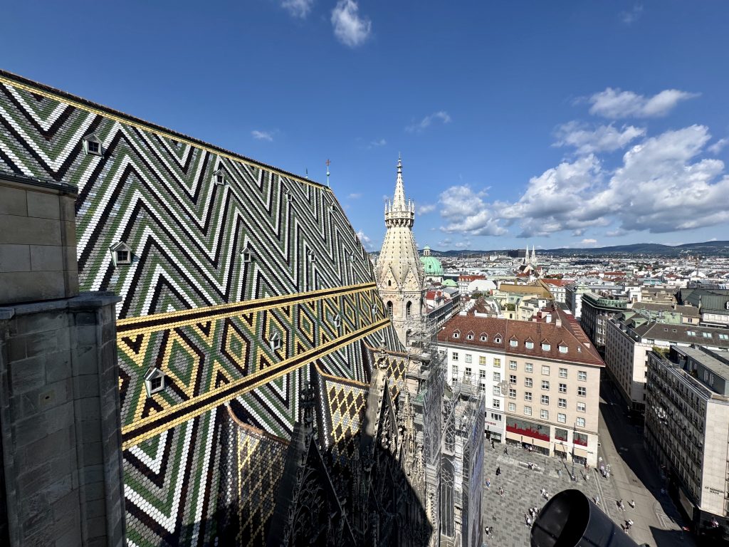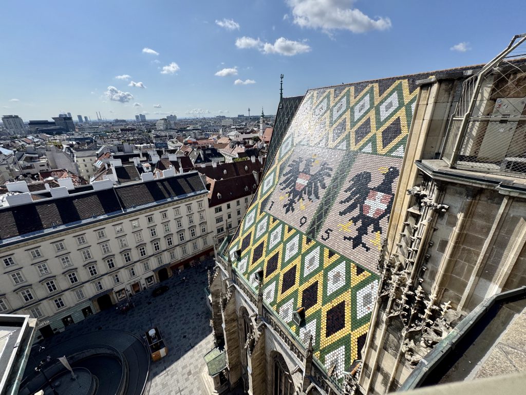 Next we revisit St Stephen’s, deciding to go up the northern tower this time, for a different view, and also we get to see New Pummerin. A 22 tonne behemoth which replaces its predecessor Old Pummerin which fell, causing a bit of a mess in 1937! The new huge bell is only rung 16 times per year as it is considered a risk to the fabric of the tower. We feel that the cathedral is quite messy and nothing like as impressive as many we have visited recently.