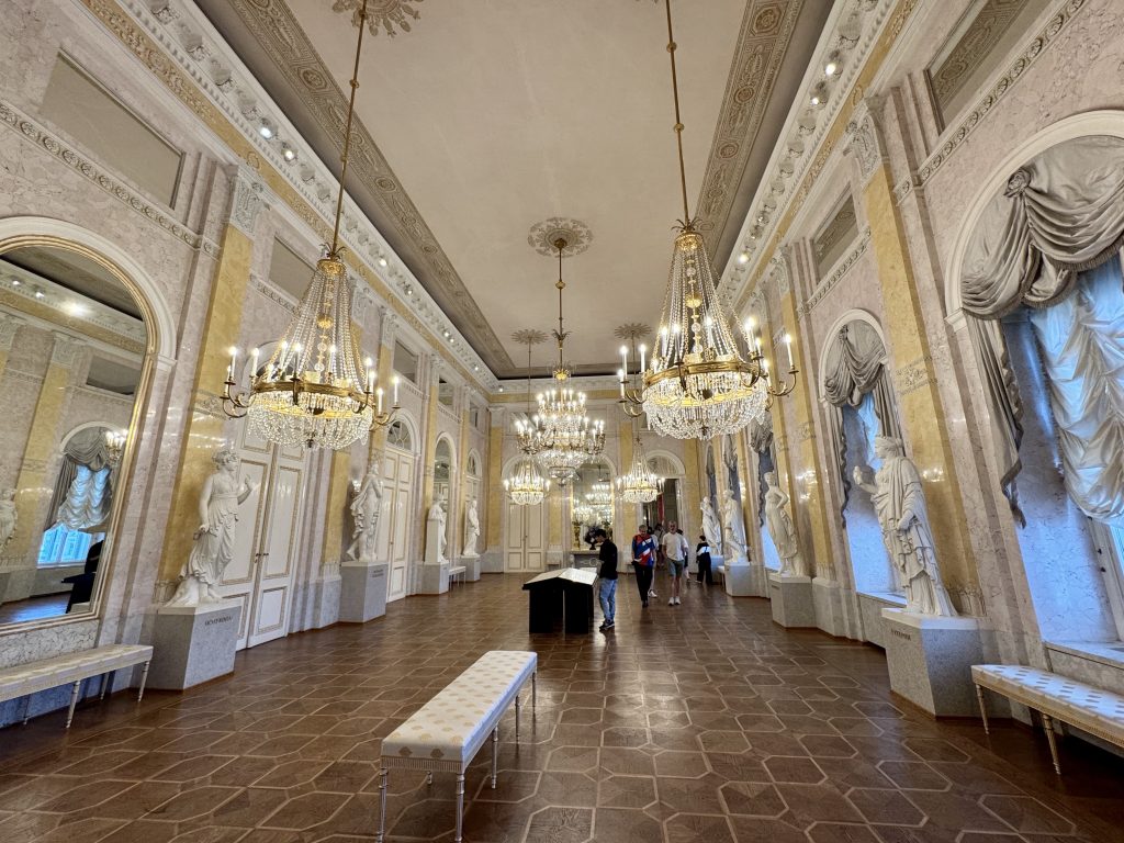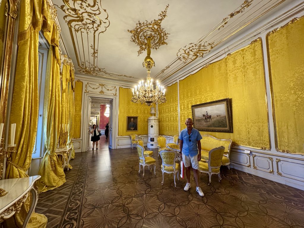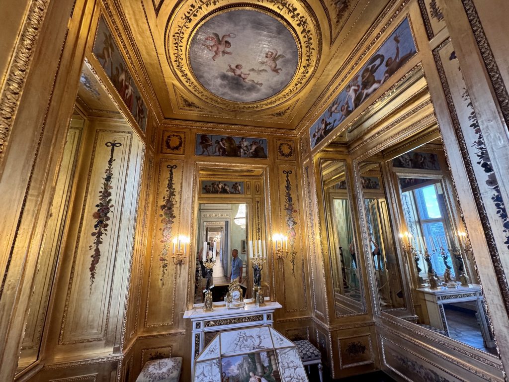 In the state rooms we find a particularly striking room where the silk wall covering, upholstery and curtains are all of the same material. We run this scenario by our interior designer friend and surprisingly she approves! Interestingly we find there used to be a set of rooms officially designated as Spanish for the use of the Spanish Royal family.