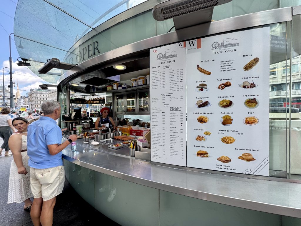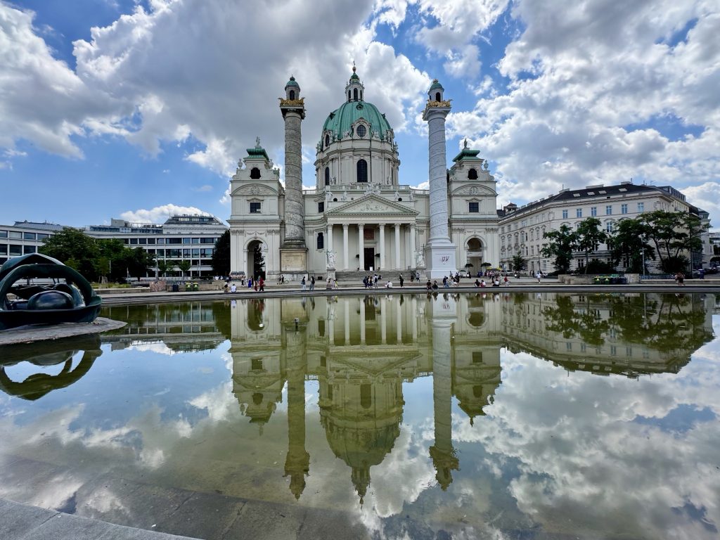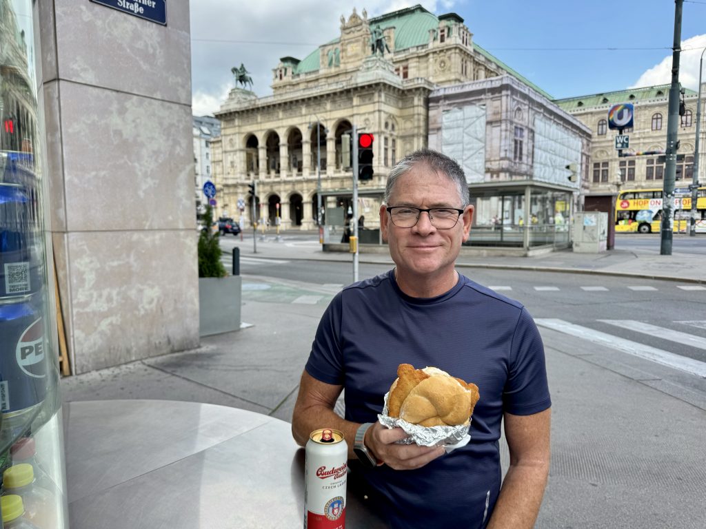 Opposite the Opera House we see a street-food vendor and order schnitzel and beer for our lunch – it’s just fabulous! We then walk on towards our next destination, St Charles Church.