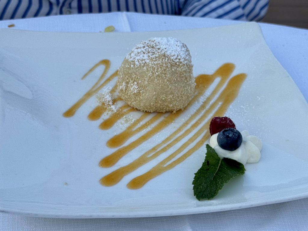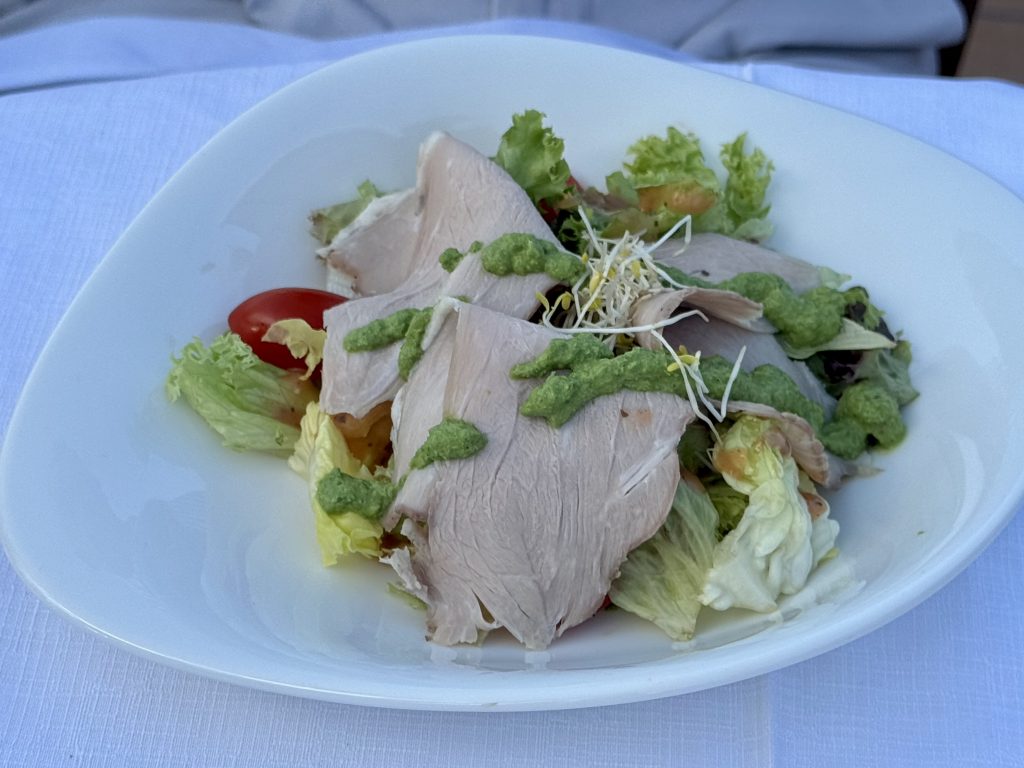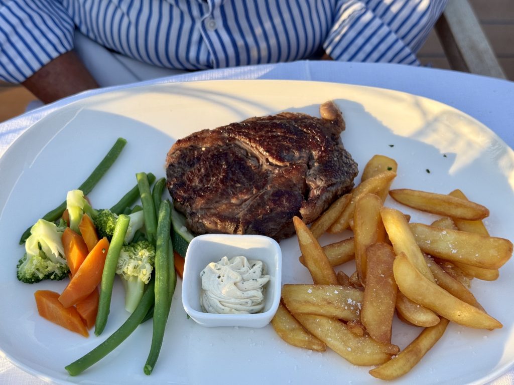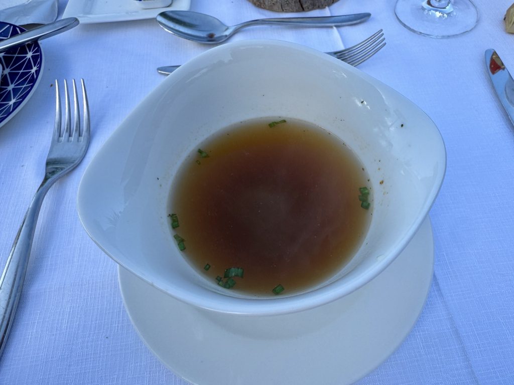 Dinner is veal salad and beef broth & liver dumpling, rib eye and pork fillet, apricot dumpling (awful) and chocolate?? (lovely!)