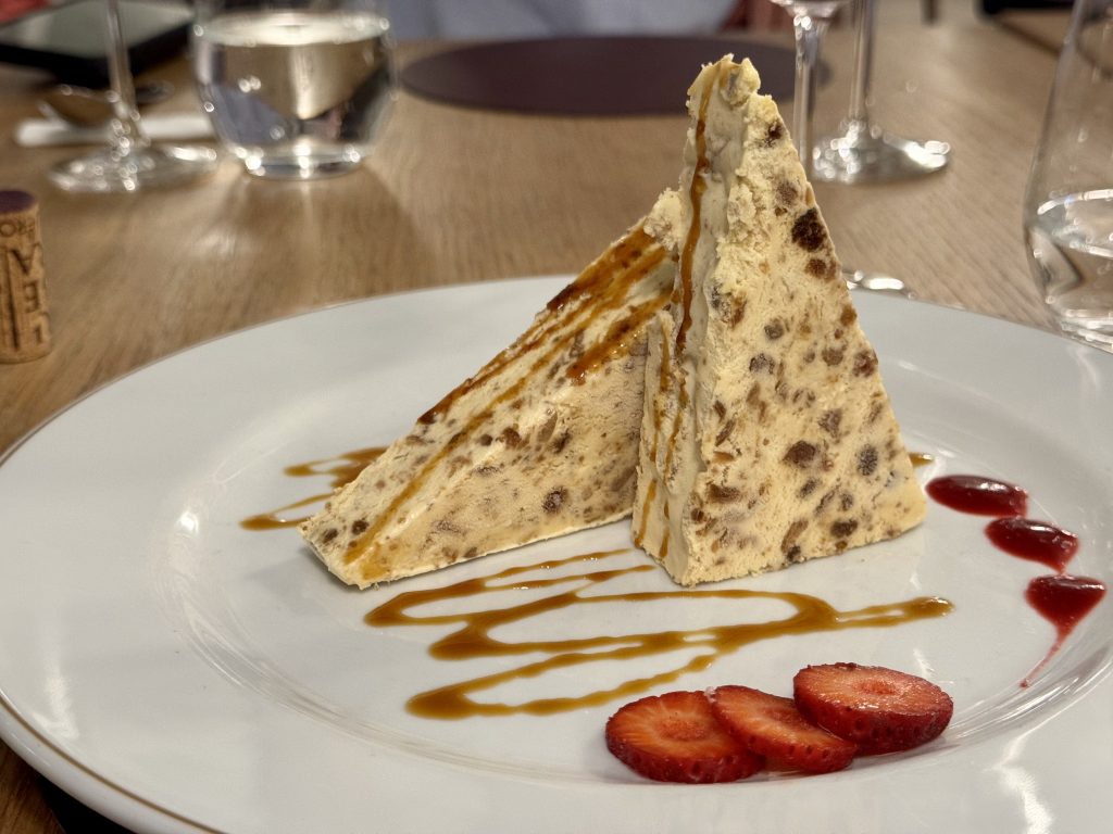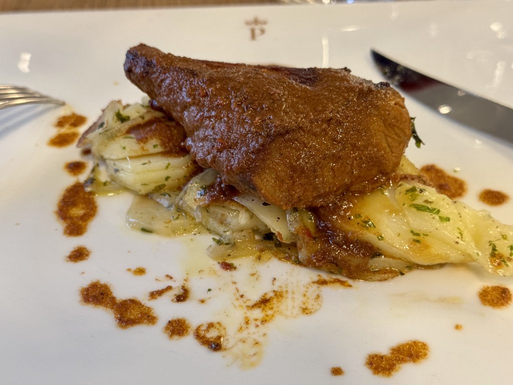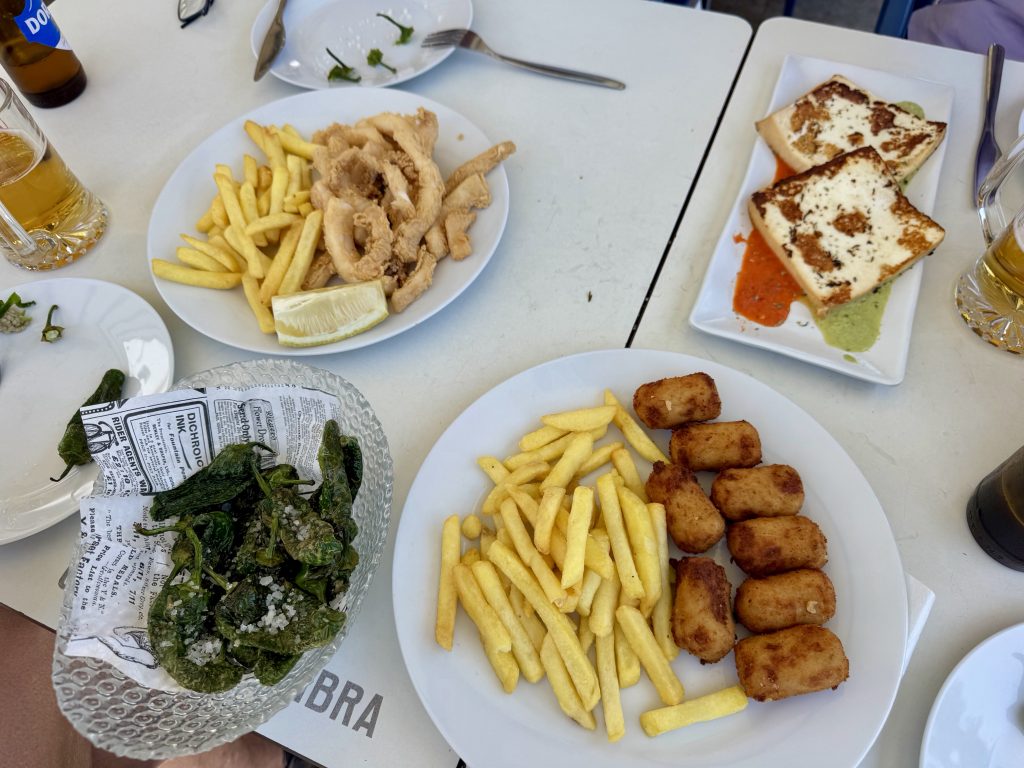 Dinner is once again excellent, at first I though my Ibérico pork fillet overcooked, but it is only the tail-end, the rest succulent and fabulous. Squid-ink rice, sea bass and goat’s cheese salad are also enjoyed, as well as meatball starters and multiple puddings.