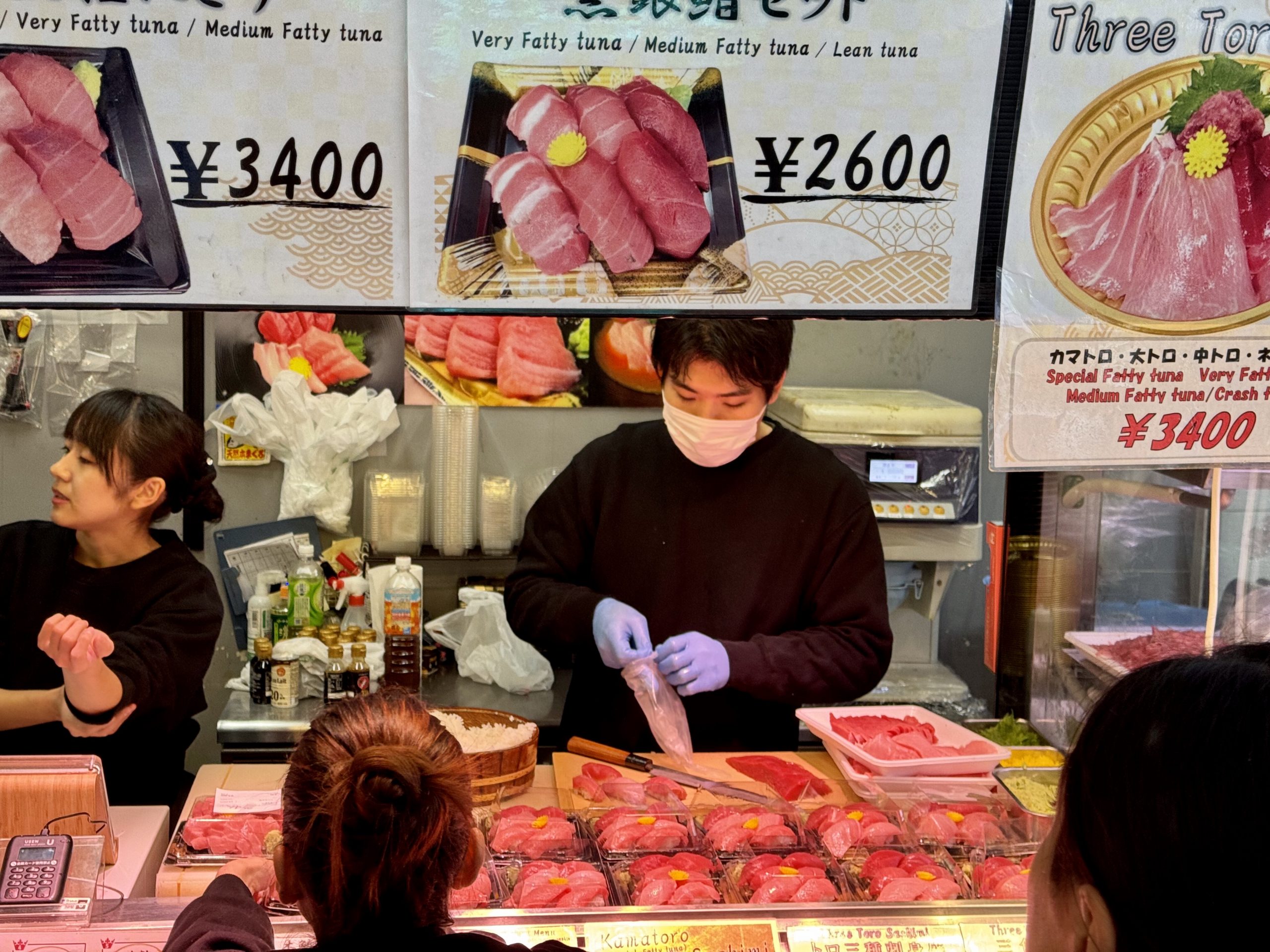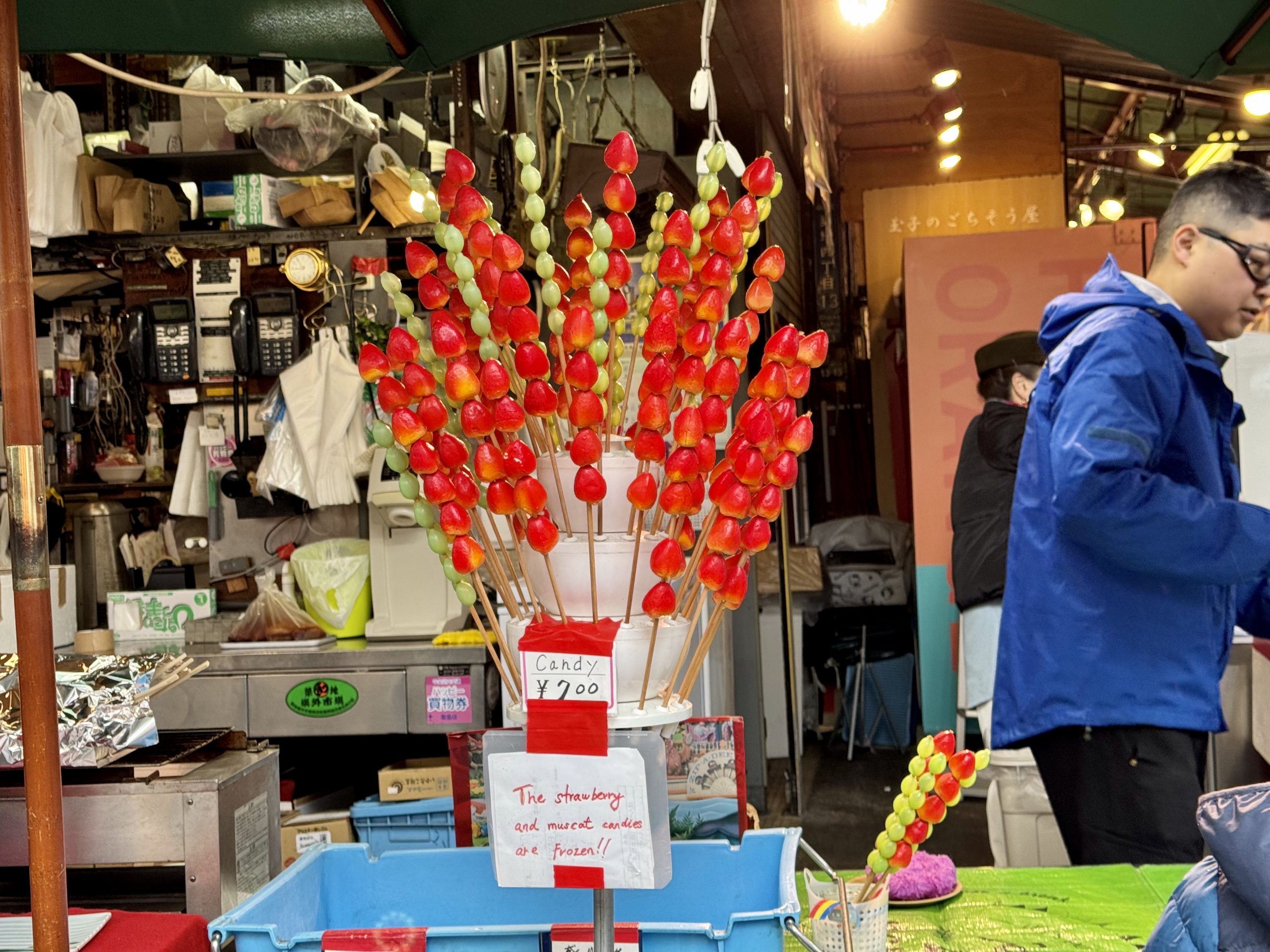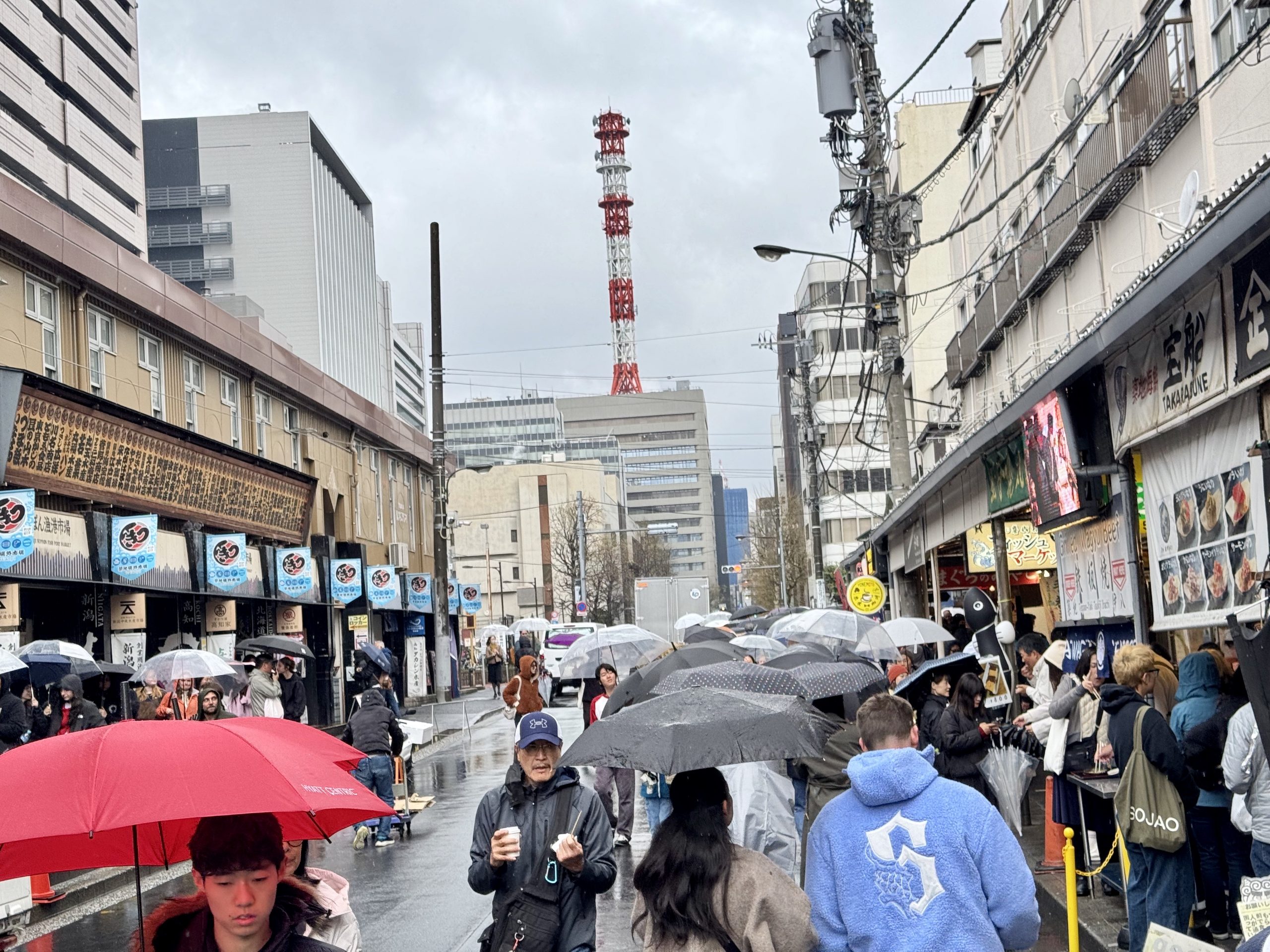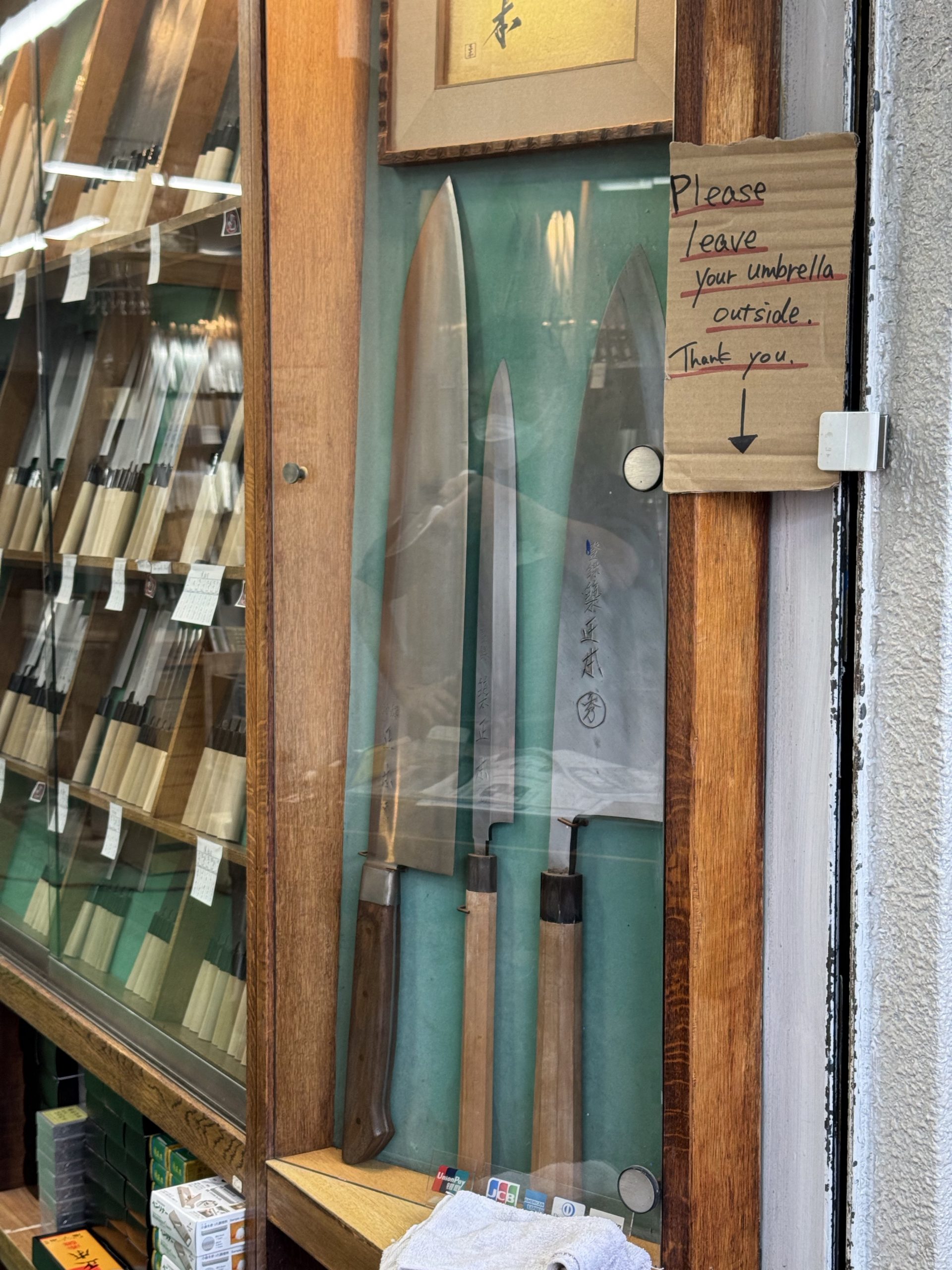 Twenty minutes later we are at our hotel in the Ginza area of the city, drop off out bags and make a quick change of clothes then head off for our first ever Japanese adventure. Firstly to the nearby markets area, where there is a fish market and street stalls, mostly it’s all about food, but there are several knife shops and some selling religious iconography. The umbrellas are a pain and we quickly move onwards.
