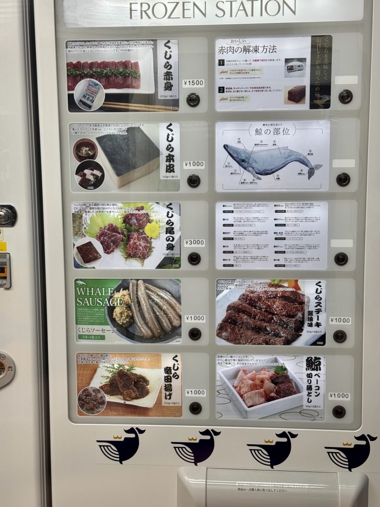 We enjoy a Snickers (51g for about 70 pence so not too bad) and then a machine vending frozen fish including whale sausage!