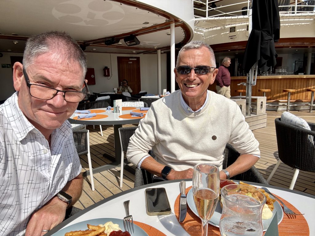 Sat at Patio Grill in the sunshine we enjoy our customary champagne and burger for first lunch, then take a spin around the decks, chatting to friends old and new.