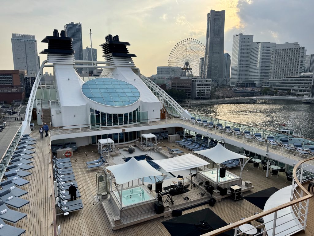 The afternoon rapidly becomes sailaway, and we enjoy a cocktail as Quest slips away from her berth, watched over and waved off by a hoard of locals, all with Japan flags flying to the accompanying military music. It couldn’t be more Eastern than this.