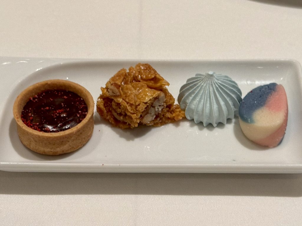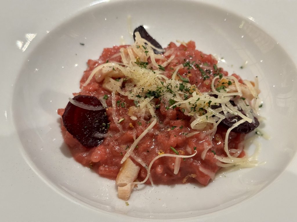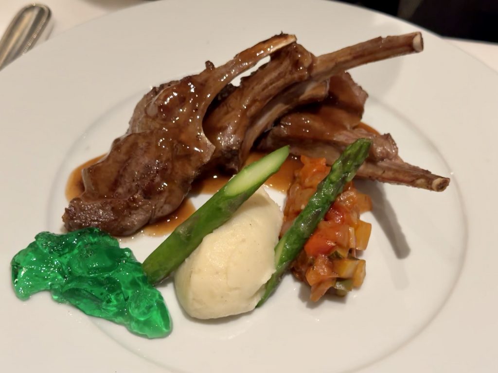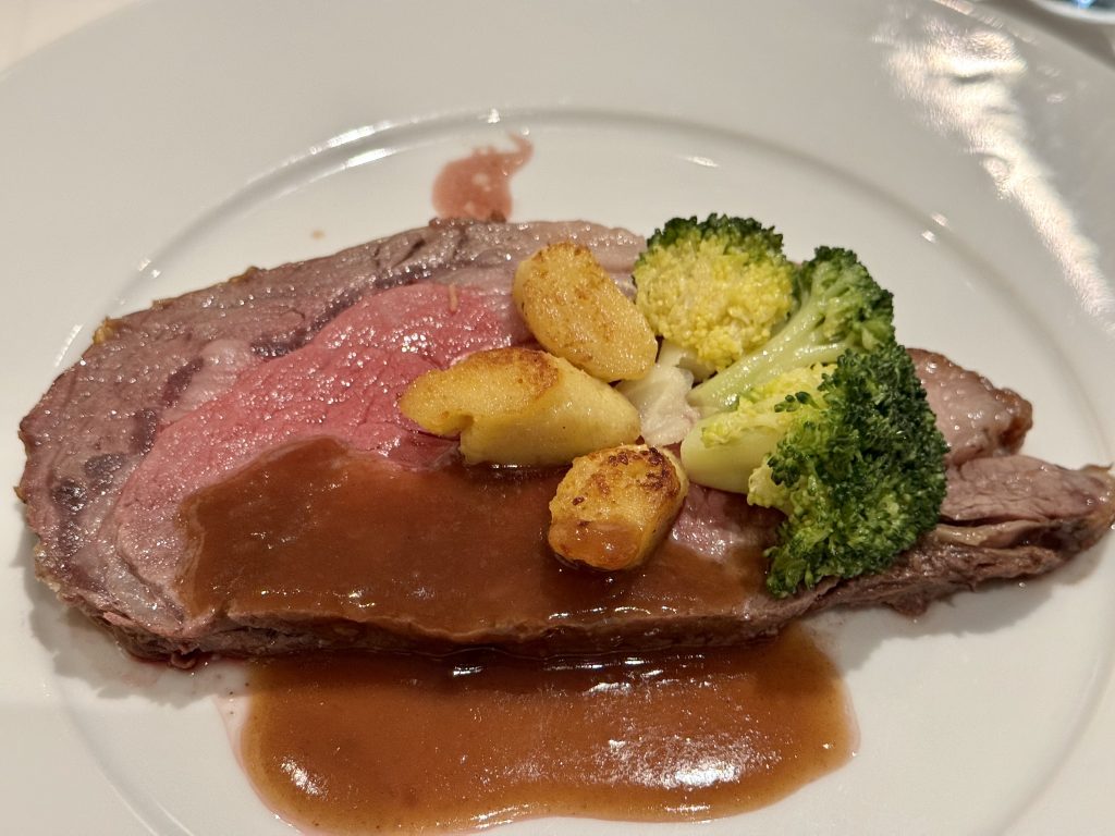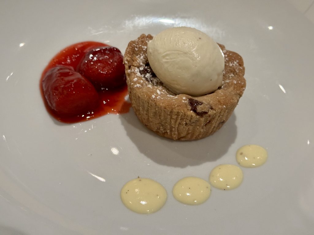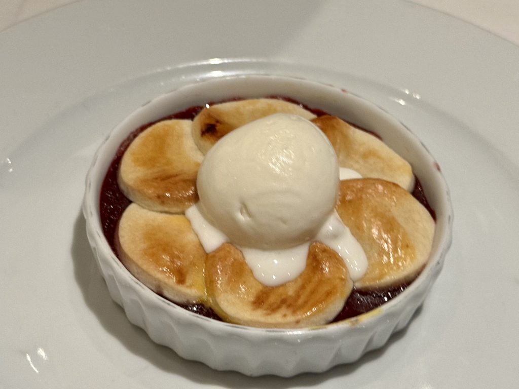 We finish with raspberry & peach cobbler and volcano cake. The former is good however the latter is a pale shadow of the Pinnacle Grill’s offering on the sister cruise line previously mentioned, but it’s vaguely acceptable.