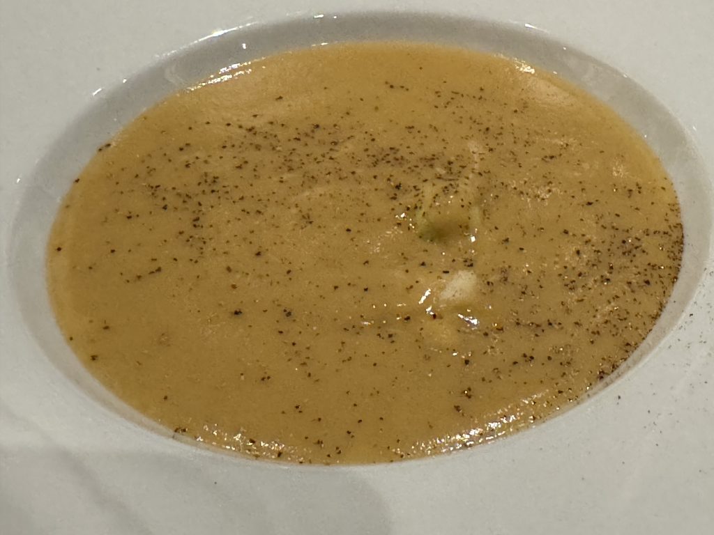 Hubby goes for caramelised pear, I have beetroot risotto, we’re both underwhelmed and he points out my versions of both are so much better. In fairness the beetroot is tasty, as is the smoked trout, but the risotto is hopelessly feeble compared to mine. Then comes garlic soup which really is excellent.