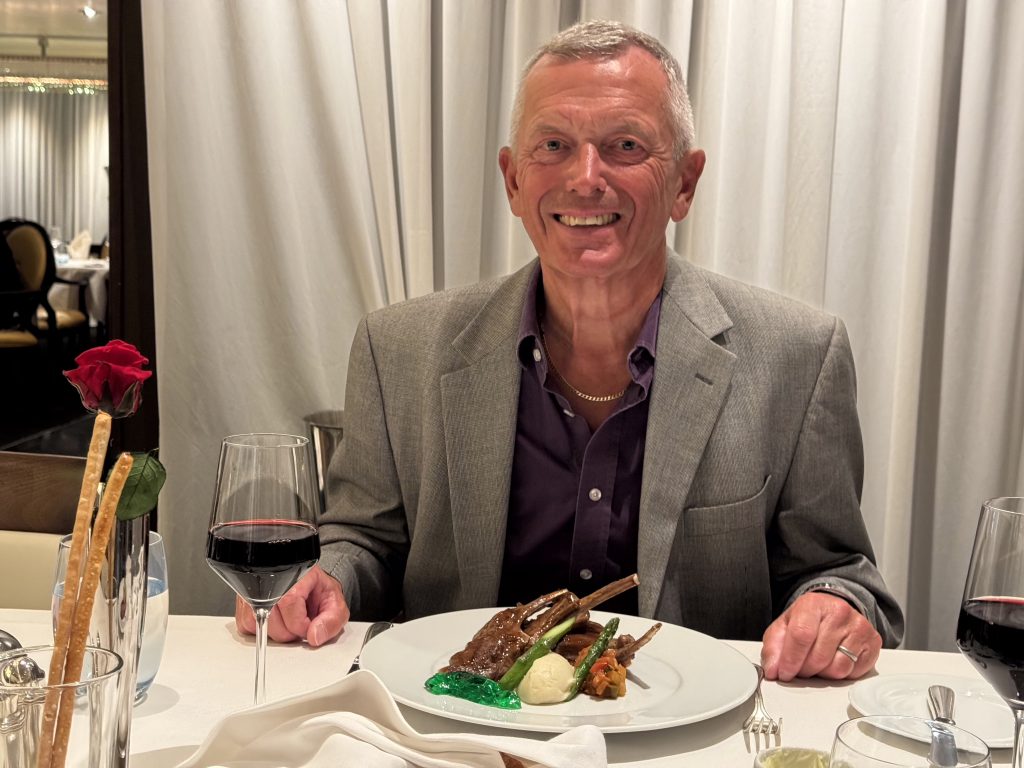 We return to our cabin to shower and dress for dinner, fixing a G&T / V&T whilst we do. Despite the 10º cold we call in at Patio Bar for our pre-dinner champagne cocktail before descending to the MDR (main dining room) on deck four.