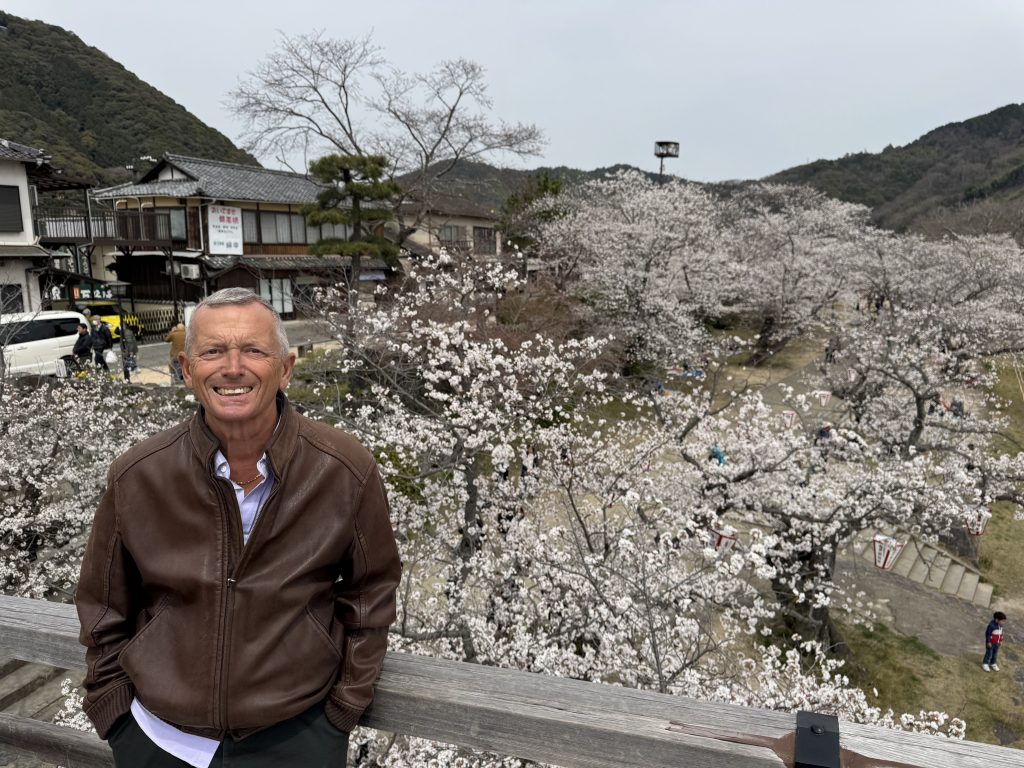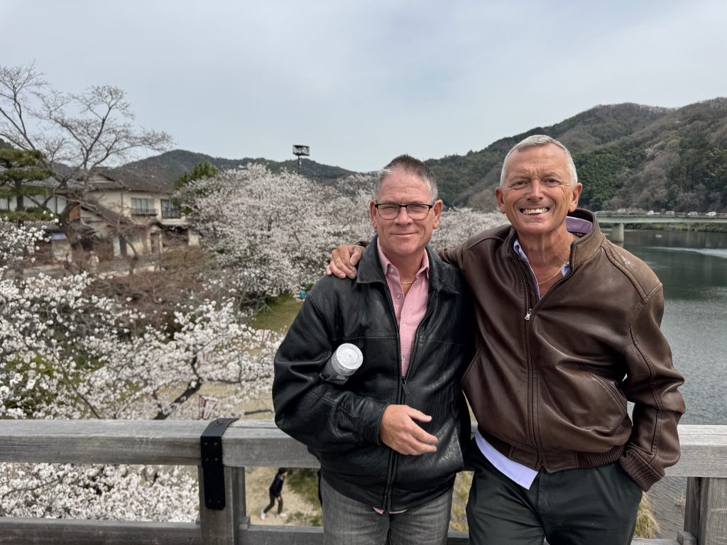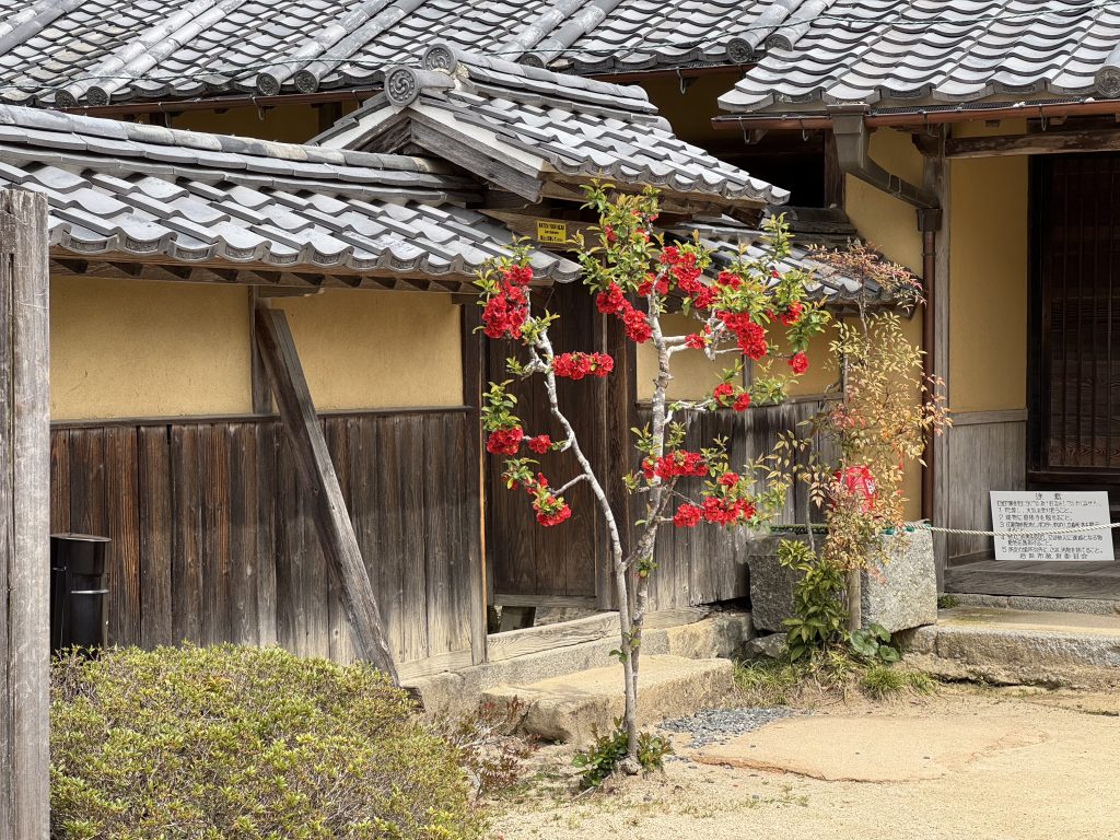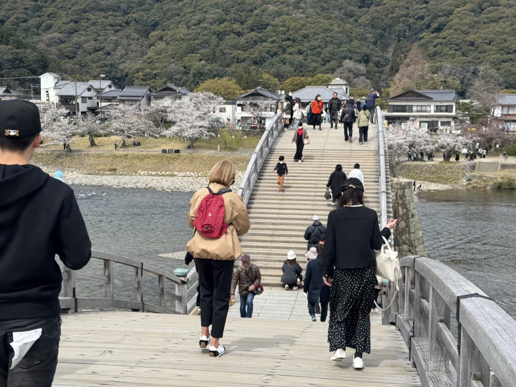 In 14 minutes we have traveled 40 km to the gorgeous old town of Iwakuni. It’s a former Samurai town built around a castle by warlord Kikkawa around 1600, his soldiers and offices occupying many houses below, which is where we are exploring.