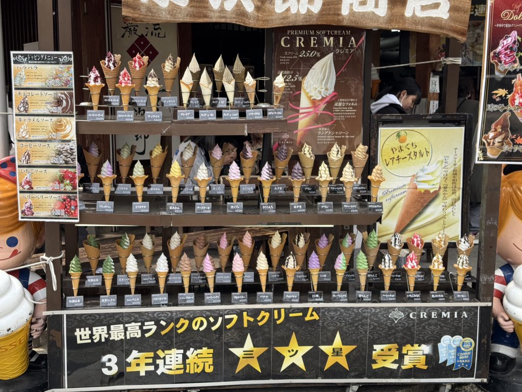 The town is quite a tourist-trap, we saw mostly Japanese, and does a massive trade in ice-cream, with crazy variations like soy-sauce or wasabi flavours alongside the more traditional varieties. With more time we might have walked up to Kikkawa’s castle but not today.
