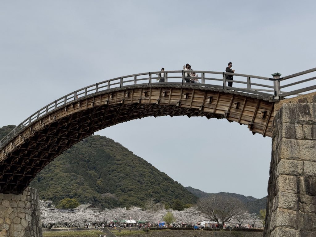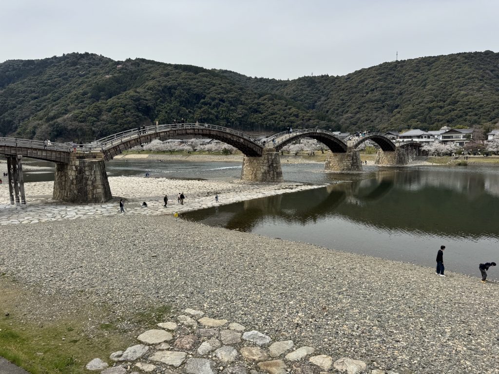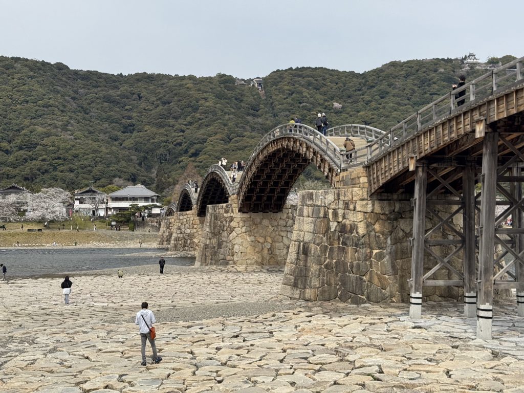 We cross the river using the Kintai Bridge, first built in 1673, rebuilt exactly as before in 1953 after a typhoon destroyed the original. It’s wooden construction is very strong and resilient to almost everything Mother Nature can offer.