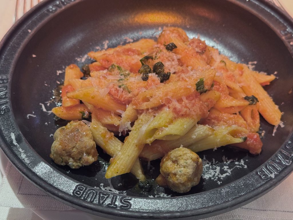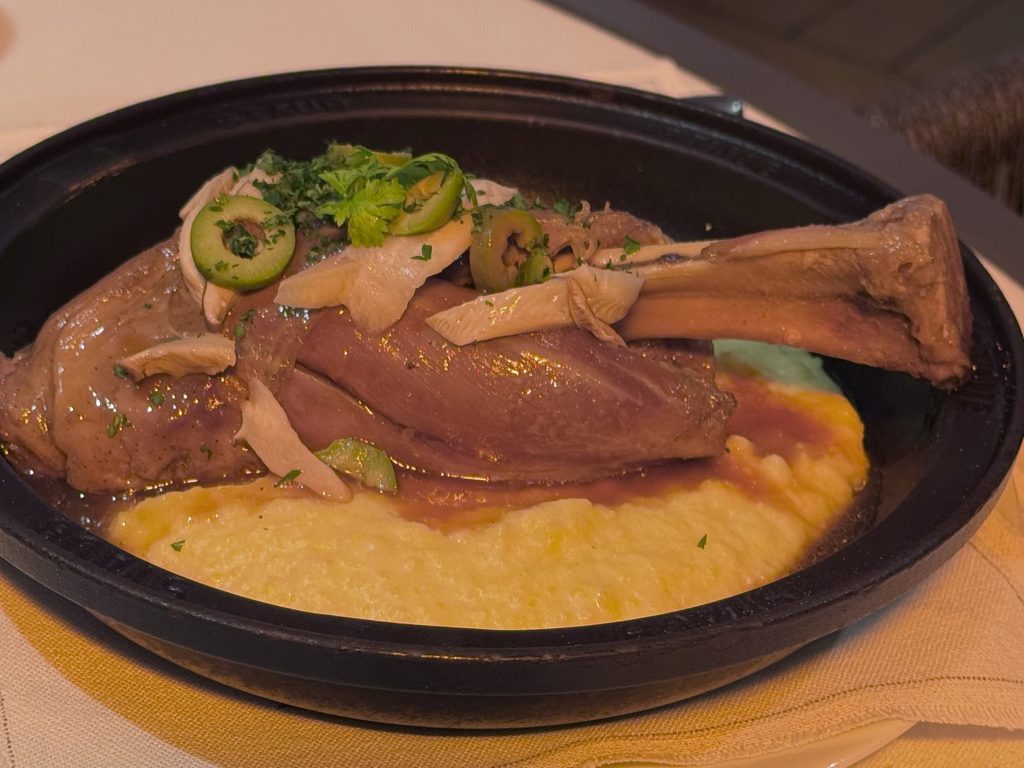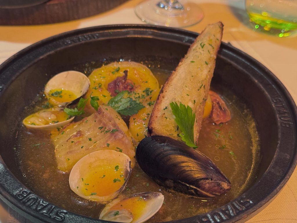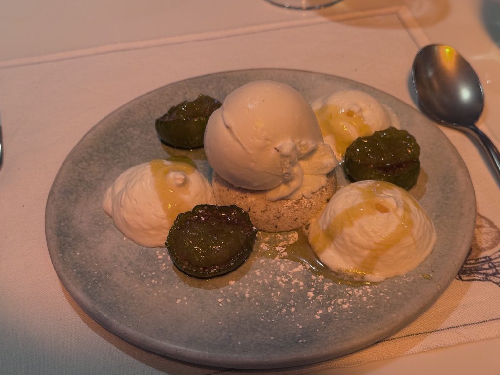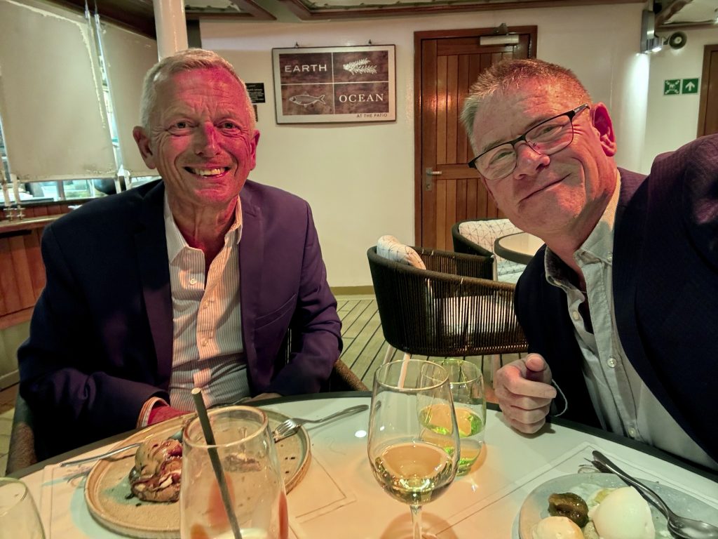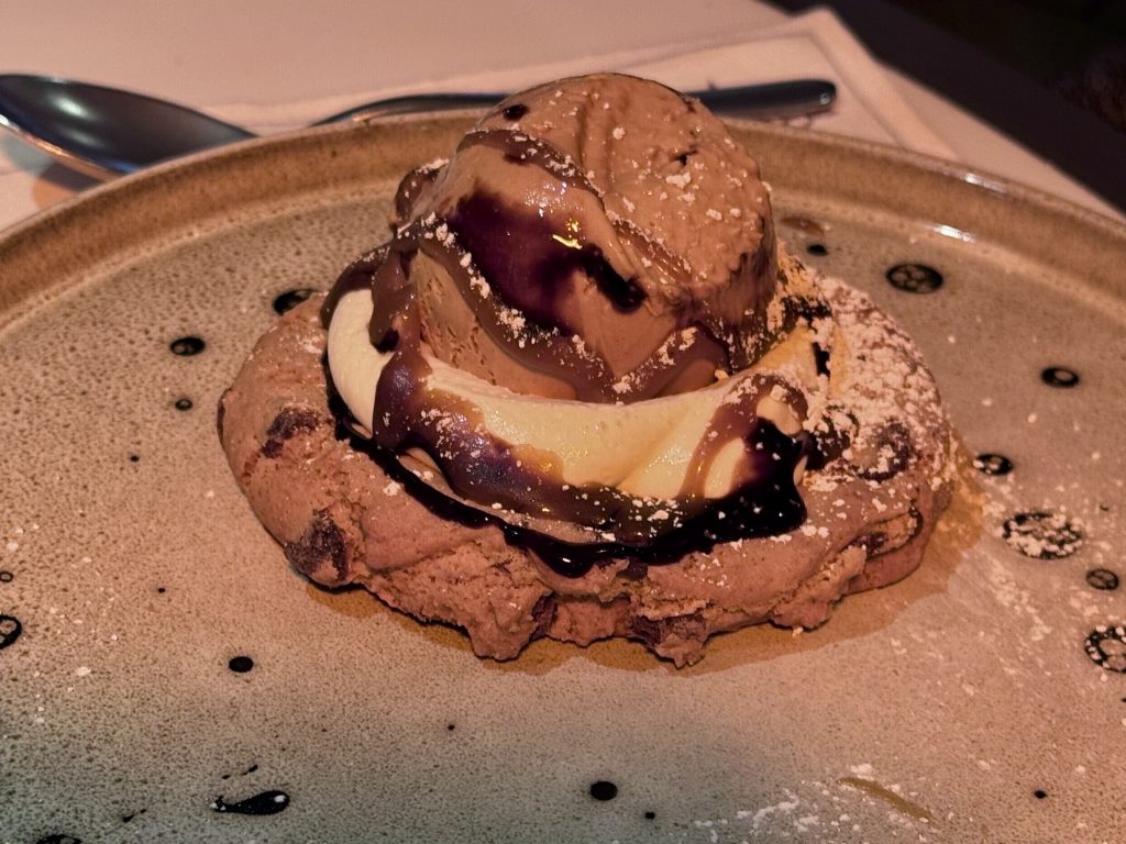 We stay poolside after our evening champagnes at Patio Bar, choosing to dine at Earth and Ocean, the name given to Patio Grill for evening service. Although cold the heaters are great and keep us warm. We both choose penne pasta, then Husband has a 12 hour braised Lamb Shank, I choose Fisherman’s Cocotte. We finish with Giant a salted caramel cookie, I have honey roasted figs. All the food is excellent tonight, the wines and service equally perfect.