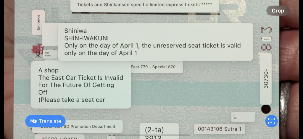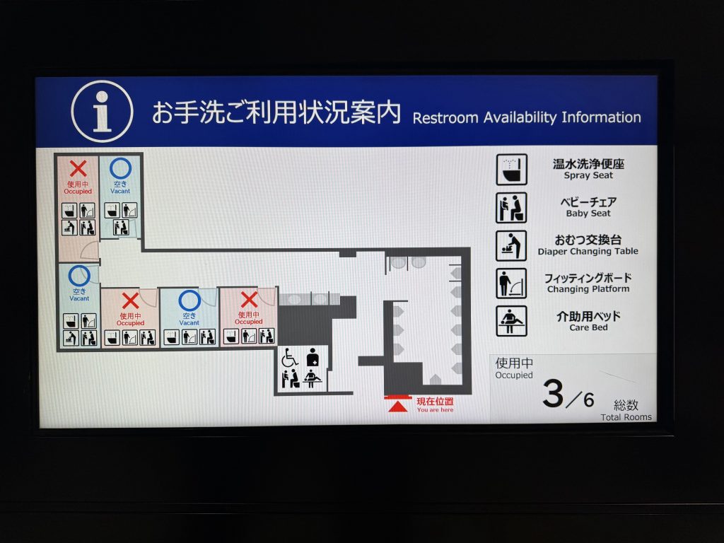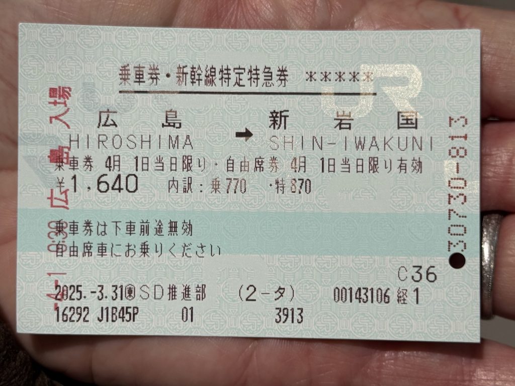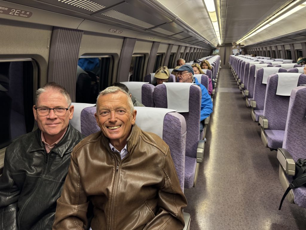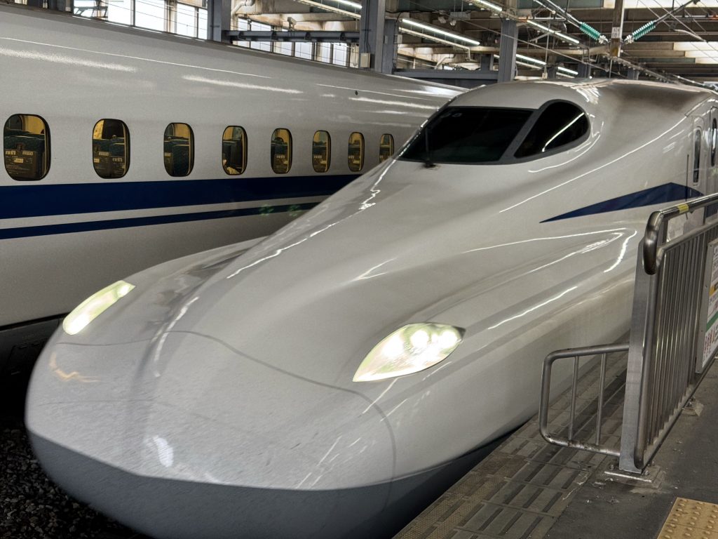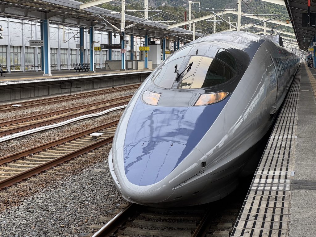 First off we breakfast en suite as we have an early bus to catch. Off we go to the Shinkansen station a few km away, and after a bathroom stop which, fascinatingly had a map to say which booths were in use, we head to track 12. Our “local” train is second and before that we see a full-sized one stop of as if for a photo-shoot.