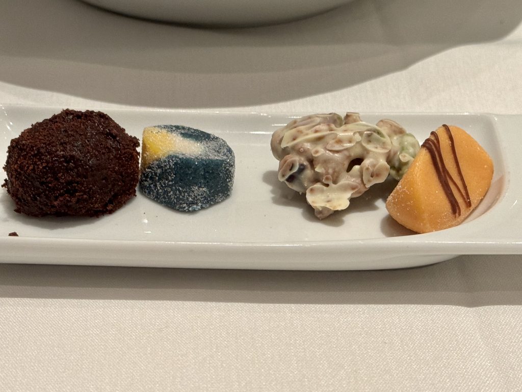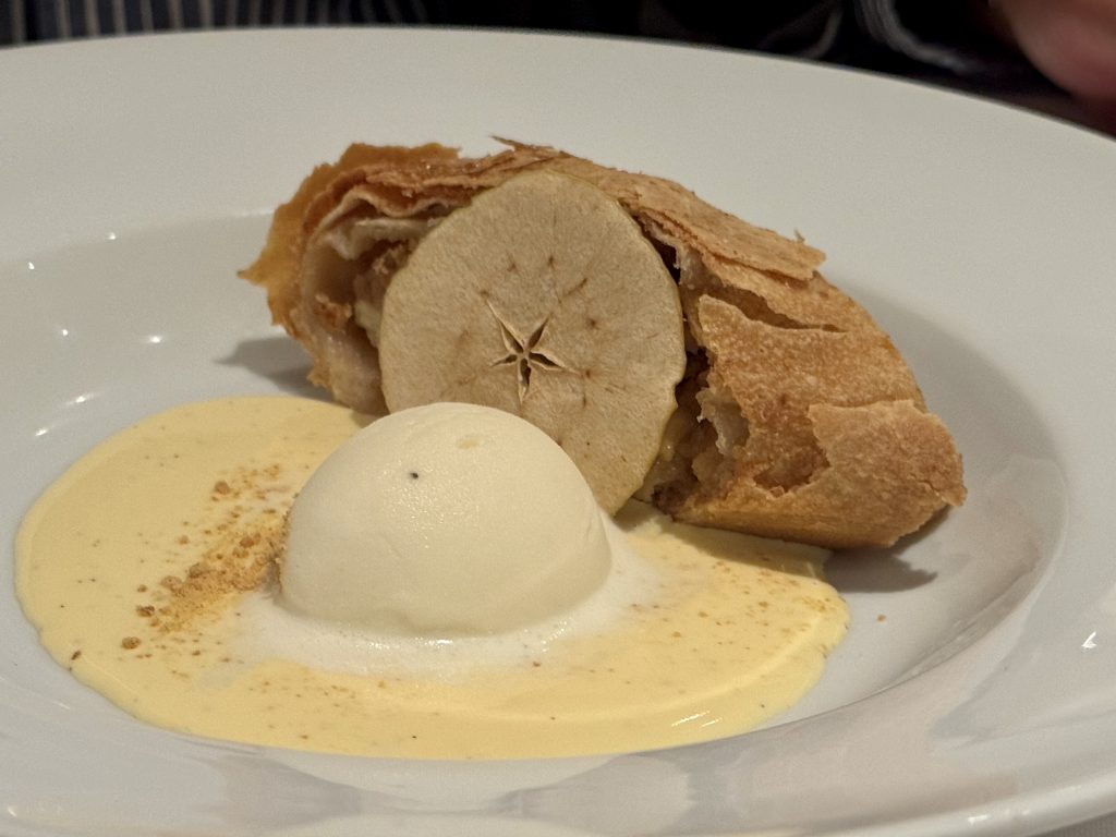 We head down to deck four, MDR again, and make our choices. Dungeness crab salad, asparagus velute and coq au vin for the Husband, spinach and duck confit scald, asparagus velute and lamb for me. The duck was really disappointing, the texture didn’t convey the idea of confit (or it’s taste) and there wasn’t enough anyway. Thankfully the other courses were amazingly good. We finish with apfelstrudel and Venoise Sundae, both absolutely gorgeous.
