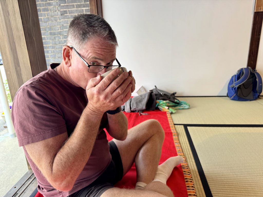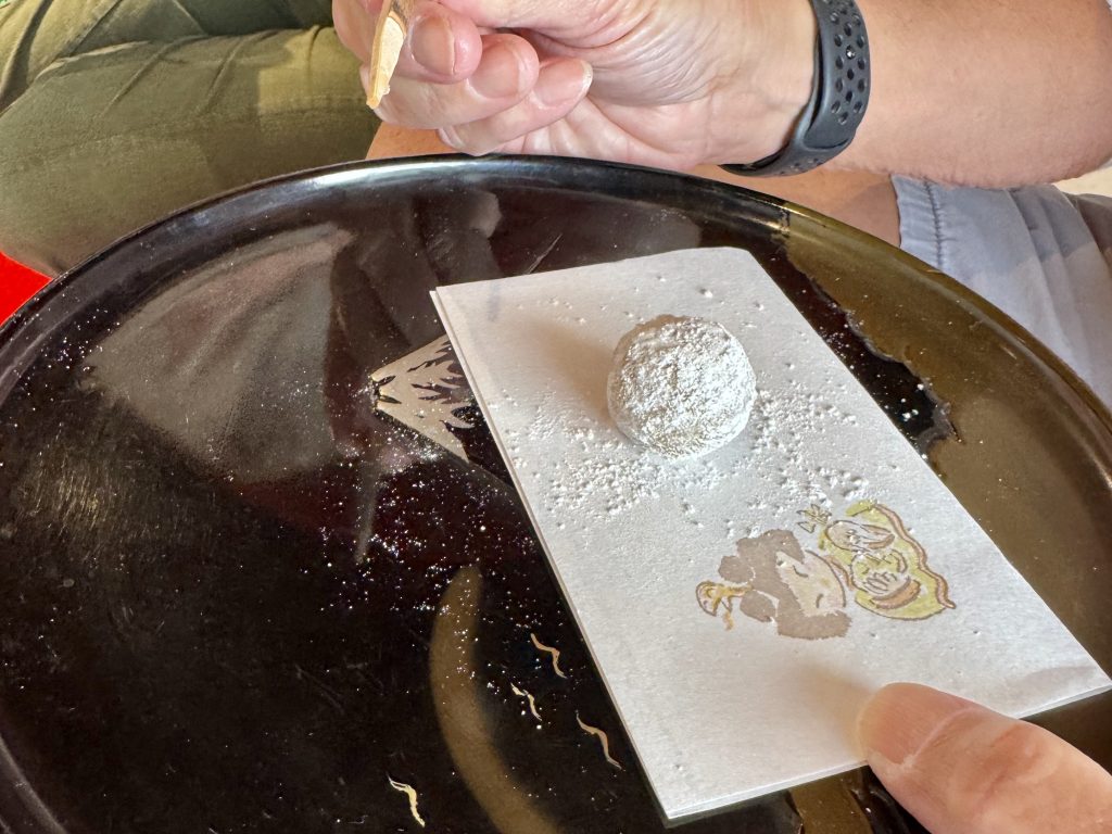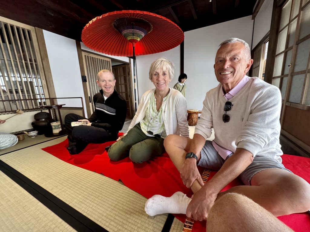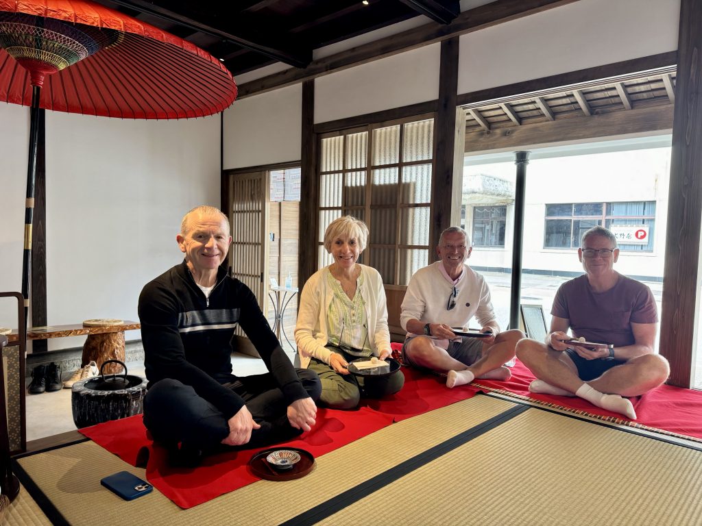 The merchant area we next visit is a street where the storehouses, made with thick mud walls, were rebuilt after a fire in 1900, so they are well conserved. We take a tea ceremony with our friends Diane and Cliff, enjoying this famous Japanese tradition.