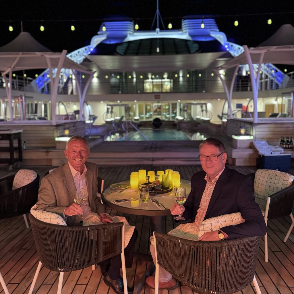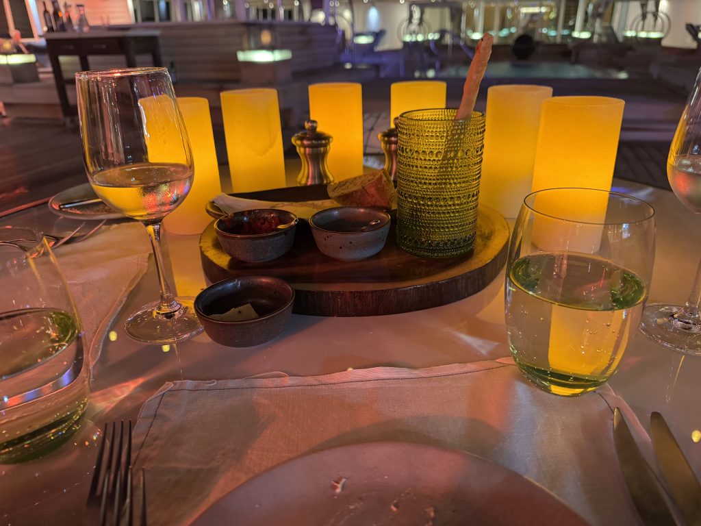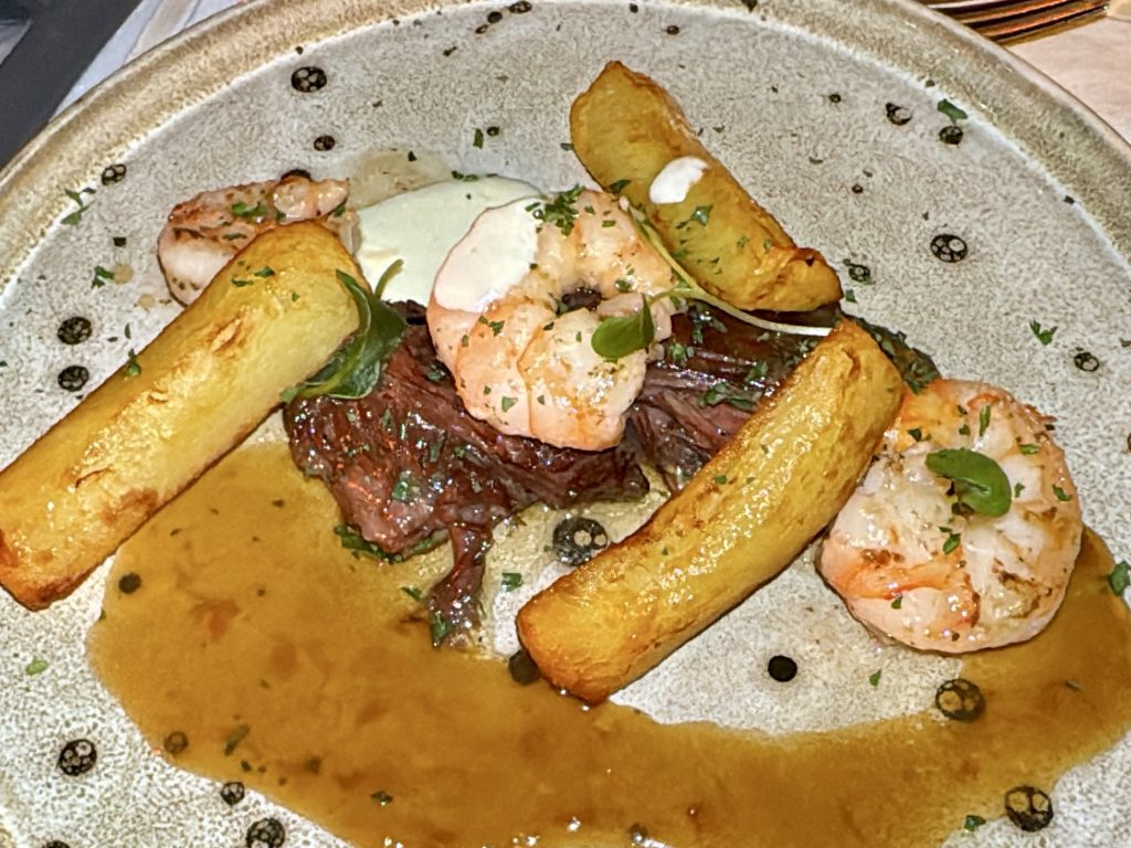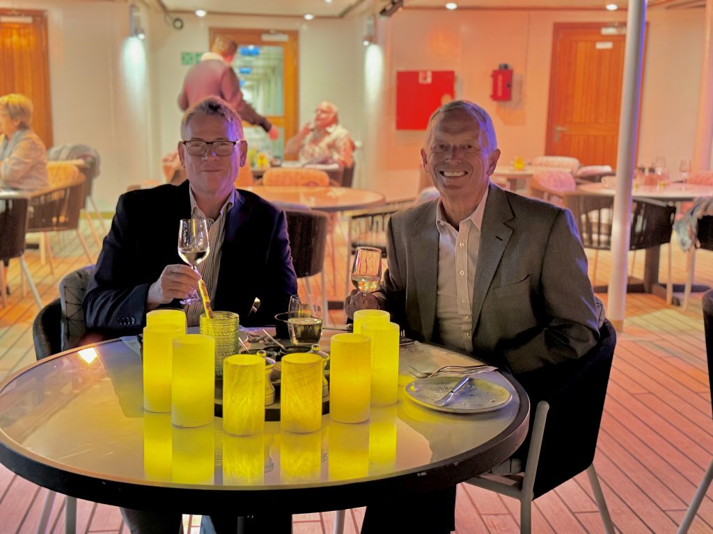 Dinner this evening is at Earth and Ocean, where we are now able to dine without the need for heating, although we’re the only ones, everyone else remains huddled under the infrared like eggs in an incubator. They’re not Yorkshiremen! It’s a fabulous dinner of meatballs, prawns, surf and turn, sea bass and finally a brioche and cherry pudding twice the size it needs to be!