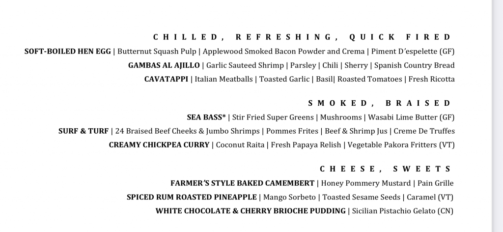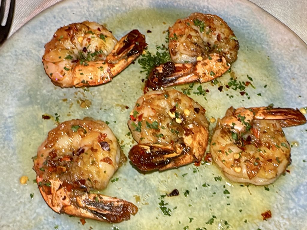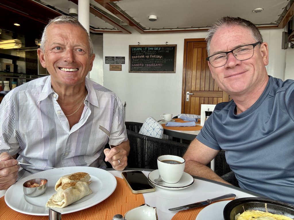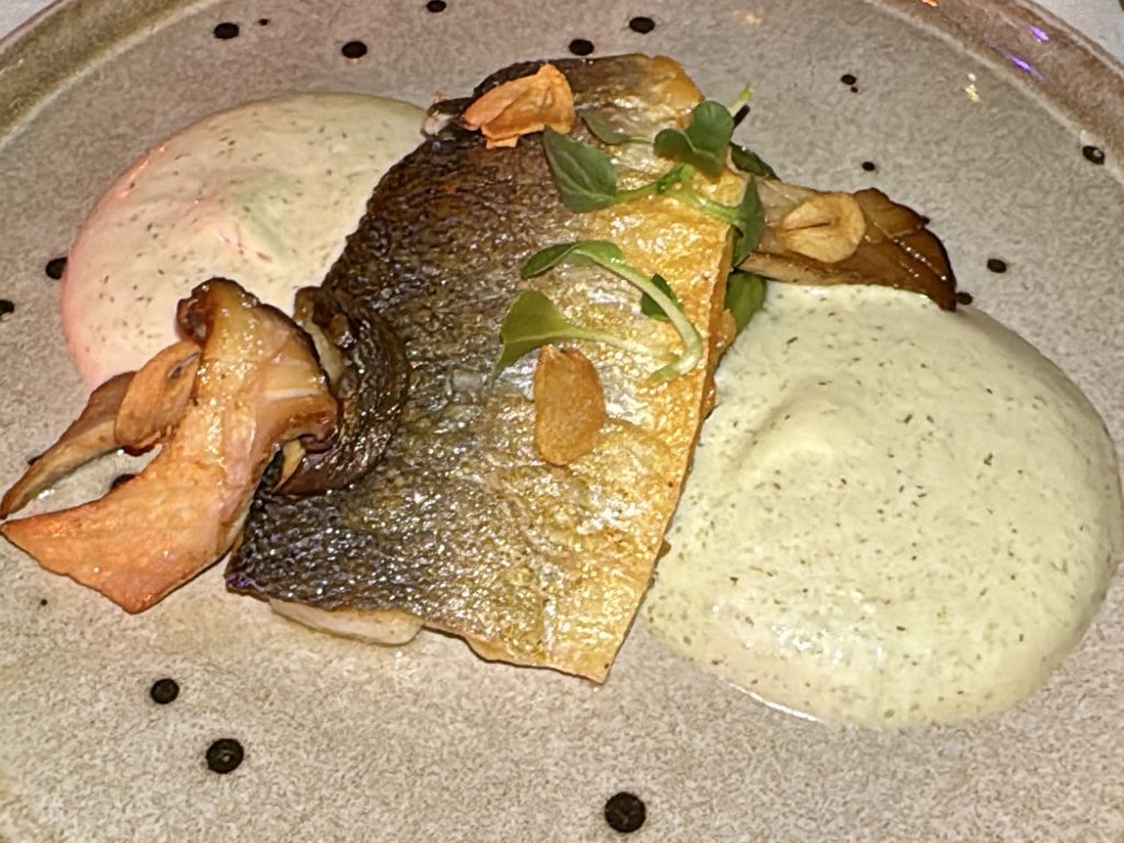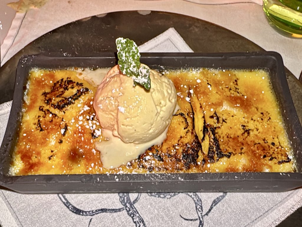 Dinner this evening is at Earth and Ocean, where we are now able to dine without the need for heating, although we’re the only ones, everyone else remains huddled under the infrared like eggs in an incubator. They’re not Yorkshiremen! It’s a fabulous dinner of meatballs, prawns, surf and turn, sea bass and finally a brioche and cherry pudding twice the size it needs to be!