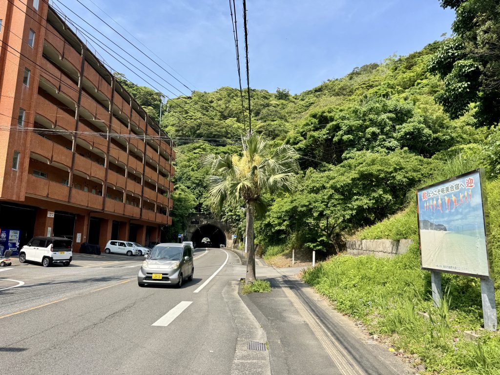 The adjoining town has a small beach, and not wanting to stop, the next town through a second tunnel is quite residential with substantial building on what is probably reclaimed land.