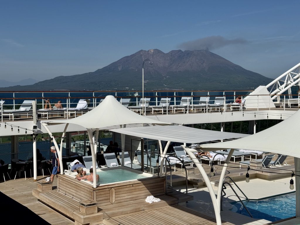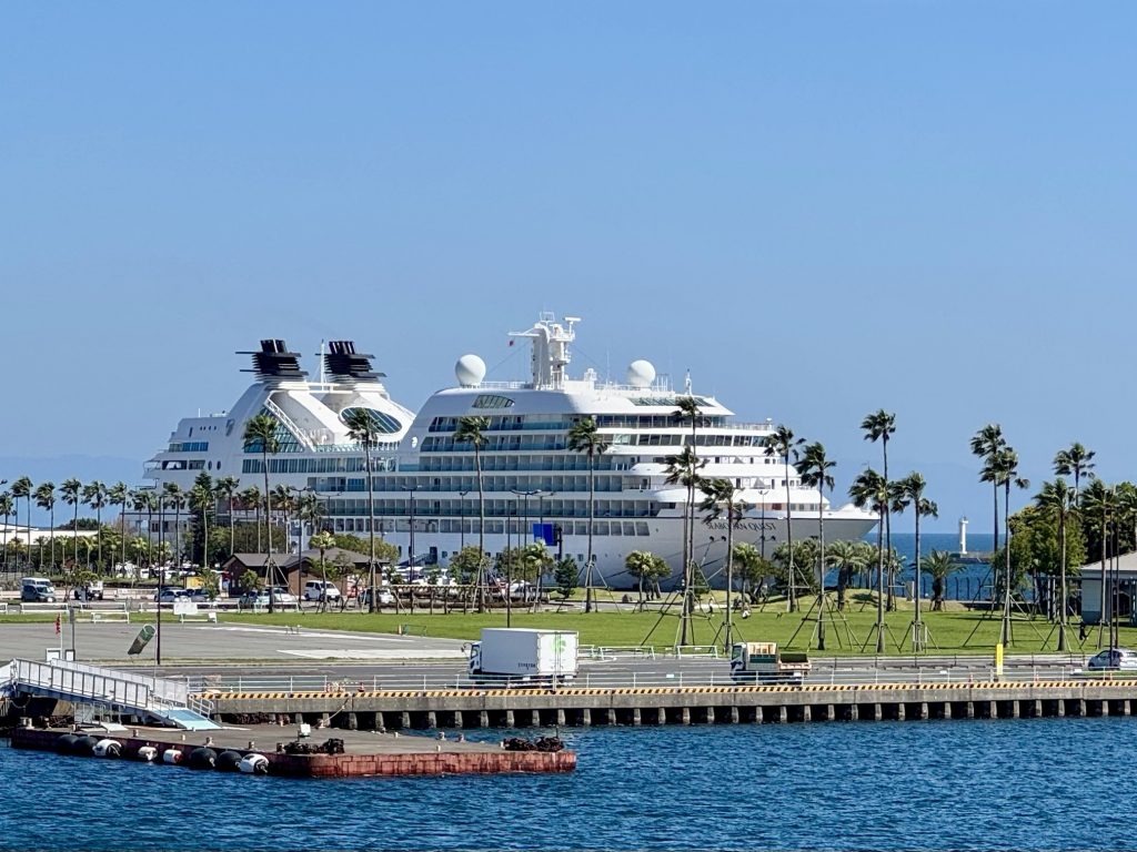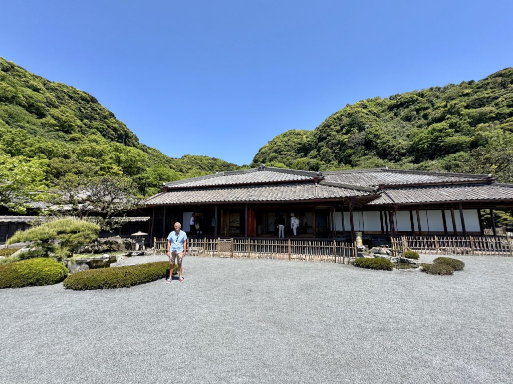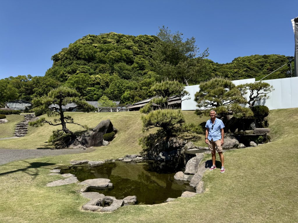 After our drop-off we walk past the ferry that goes across to the volcano, note that Ponant’s Le Soléal is parked right in town (she’s only 1/3 our size so forgiven for this impudence) and then pass a lovely memorial garden as we walk onwards to Sengan-en, an UNESCO heritage gardens.