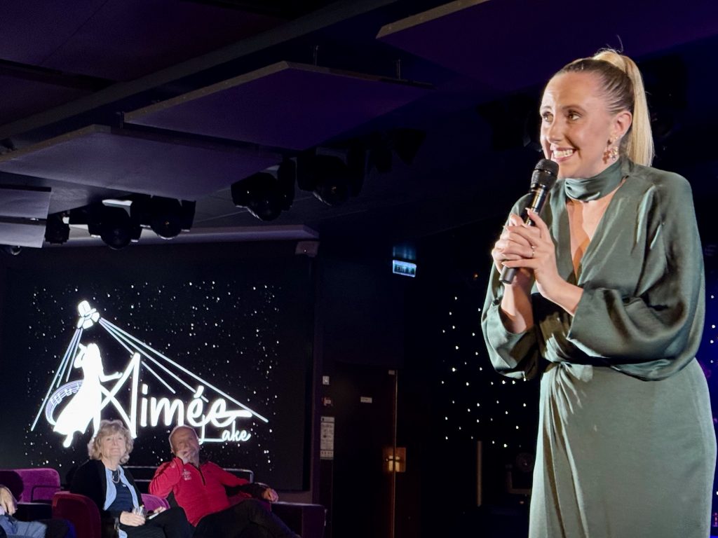 “Tonight’s pre-dinner show on Quest is the indefatigable Aimée our superb cruise director.