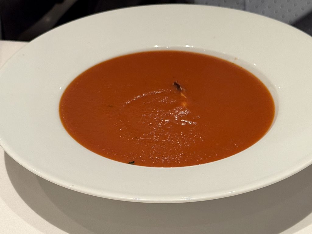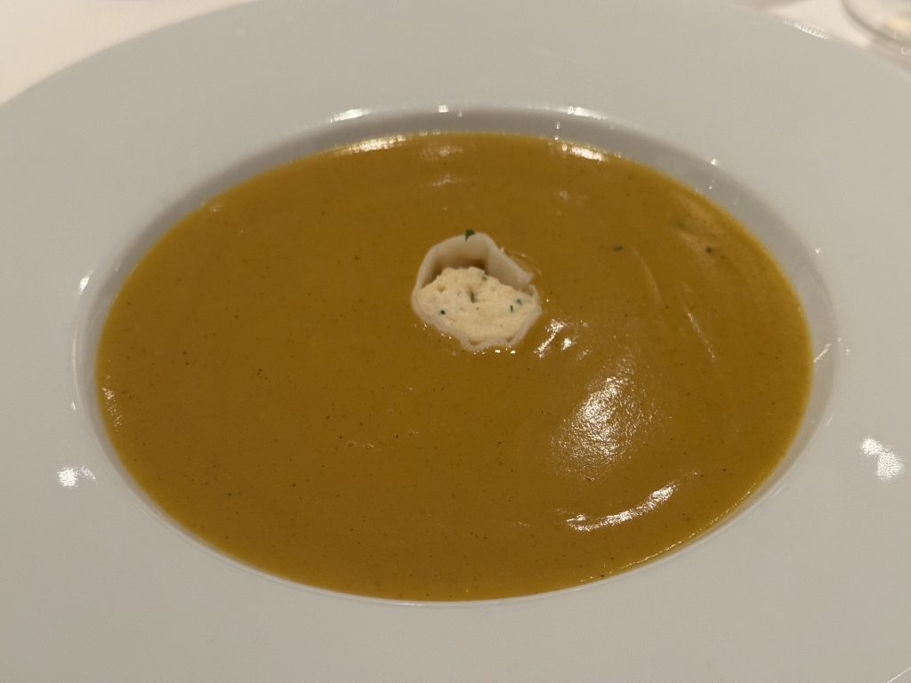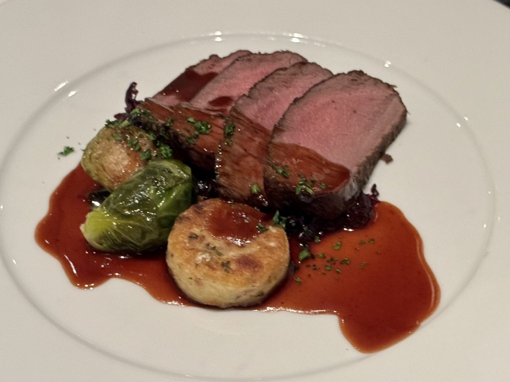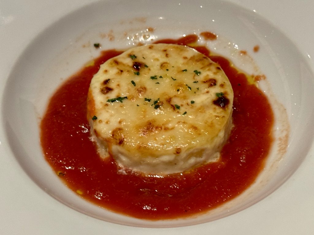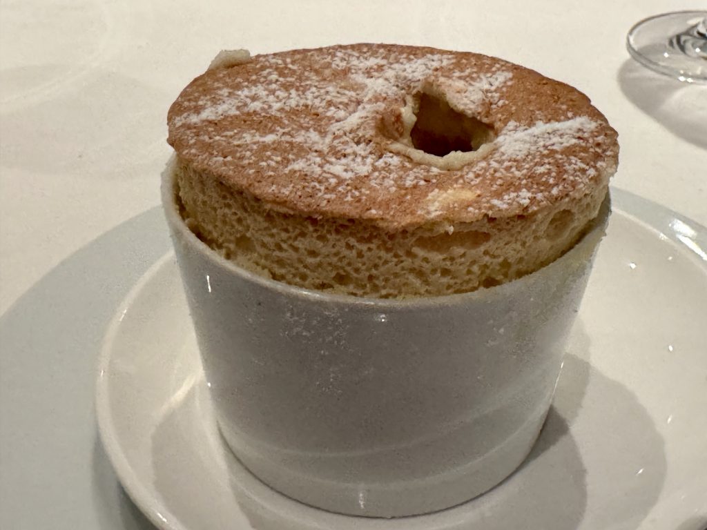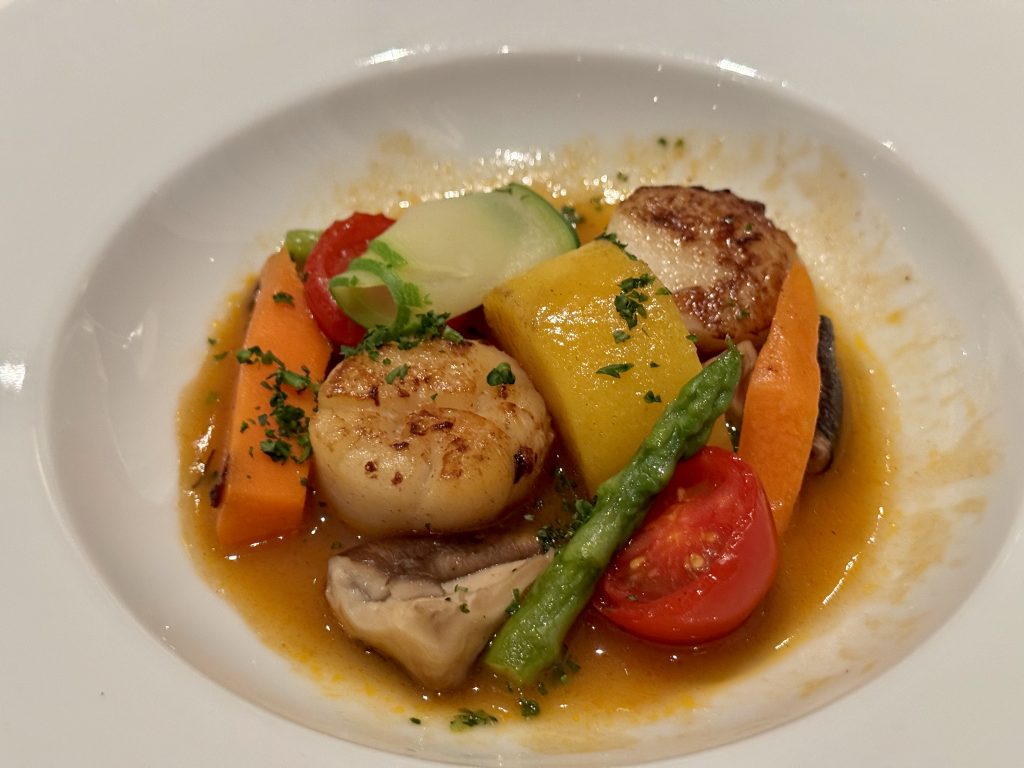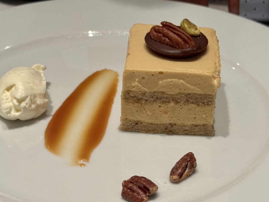 Dinner is in MDR tonight we have different choices … him: gnocchi, tomato soup, venison and pecan cake; me: scallops, carrot & curry soup, pork and soufflé du jour. Every course is perfect! See composite menu if interested in the details.