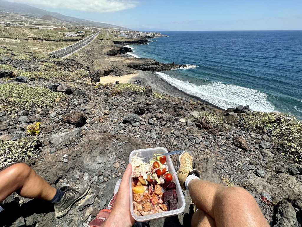 Moving on we pass a cute church and then the nearby beach, before walking through Casablanca, not the one where nobody ever said “play it again Sam” obviously. The final leg is to reach Las Eras but as we come to a cliff-hanger on the cutting above the motorway, we decide it’s enough and break out much-needed lunch – salad with sous vide pork loin wrapped in Serrano, and stuffed with chorizo – gorgeous!