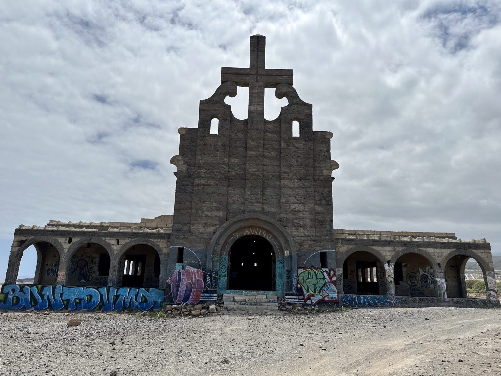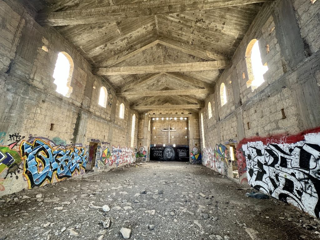 Built by the army during the war, it remained in military grade mothballs until 2001, afterwhich it has become home to graffiti artists and (apparently) some infamous raves. Still off-limits, people do what is intrinsically expected in Spain regardless – to go exactly where they want anyway. The church is weird enough, but in profile taken on an air of “Dark Satanic Mill.”