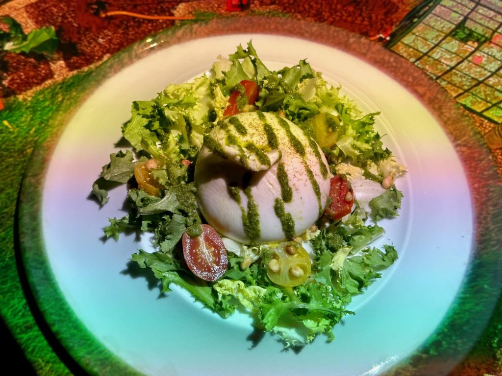 At the outset we’re asked to keep the table free of personal items – why, because it’s the stage, and within moments we’re treated to a projected garden scene, complete with greenhouse, vegetable plot and a pesky mole. The little chef goes about his business, thwarted by Mr Mole’s behaviour until the final explosion reveals a plate, which is soon substituted by the real thing, our first course is a whole burrata with pesto dressing and perfect salad accompaniments.