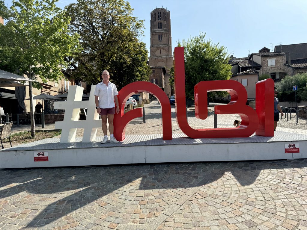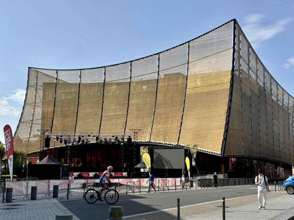 We head back towards town, taking a lower trajectory, and happily pass by the arts quarter, finding the local dance school, cinema and theatre. Here there is the rigging of outdoor staging and seating for a ten-day contemporary dance festival, last night tonight so we’re not going to see that, impressive as it looks.