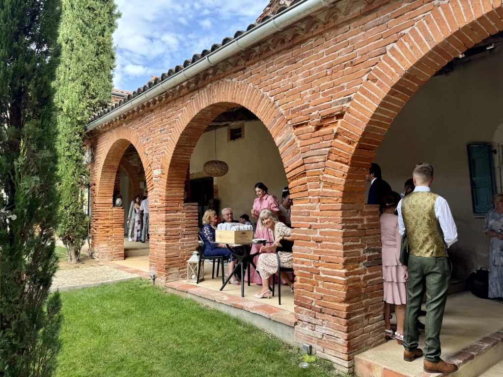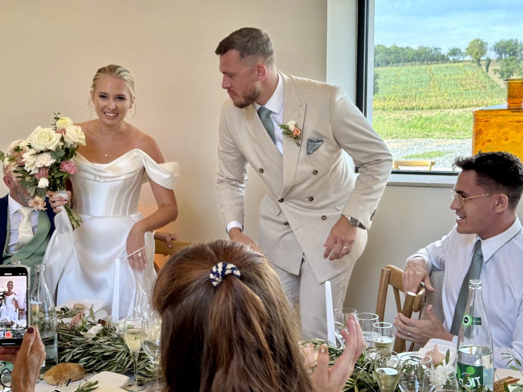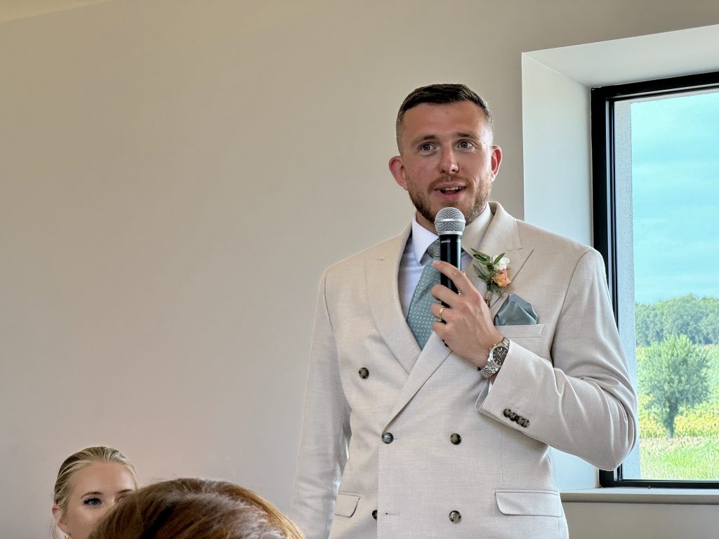 Soon we’re back into the courtyard and then the attached barn where the Wedding Breakfast will be served. After a few speeches we enjoy an excellent meal then more speeches.